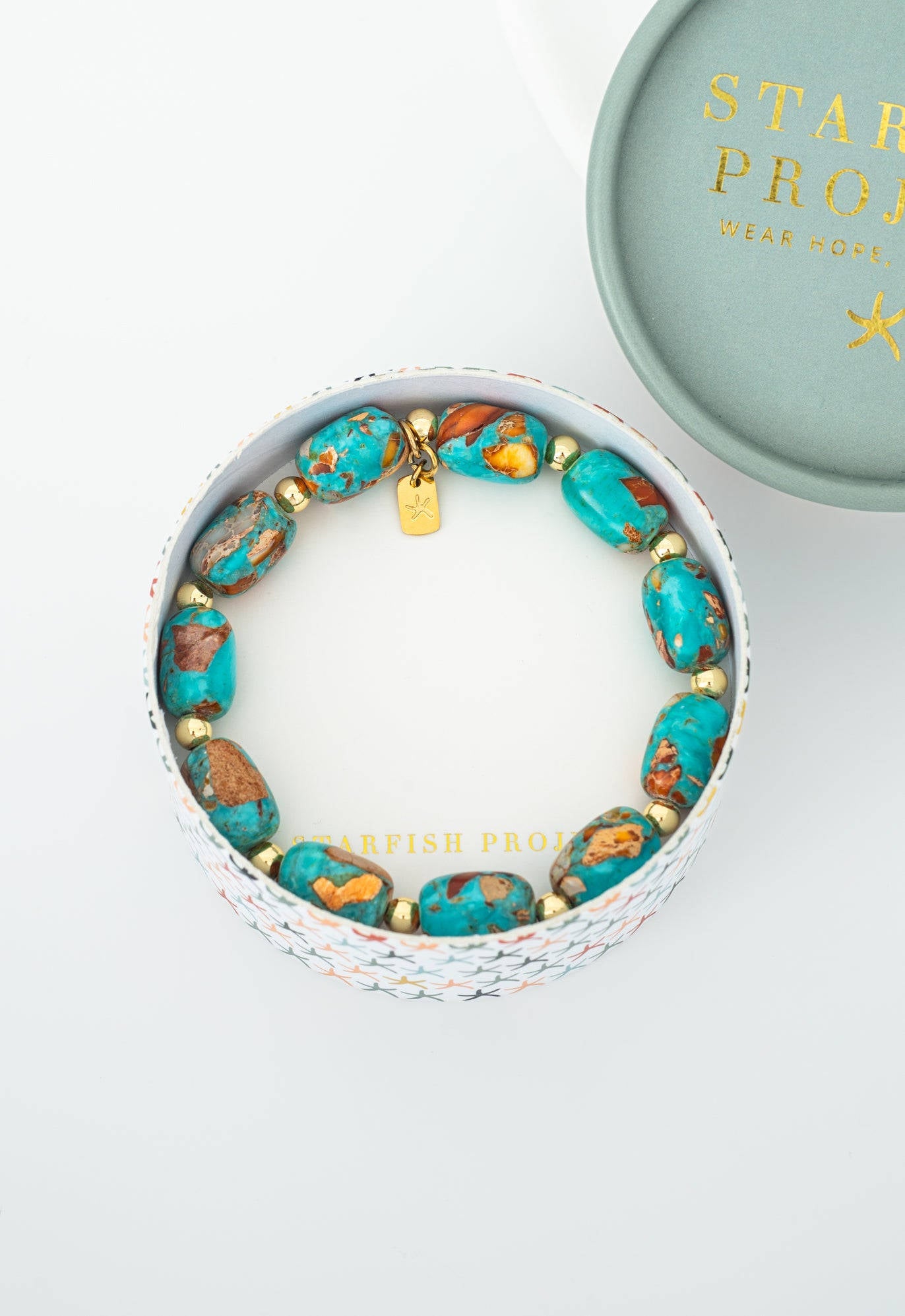 This Sierra Bloom Turquoise Emperor Stone Beaded Bracelet by Starfish Project is a meaningful and beautiful accessory. Hand-strung with vibrant turquoise emperor stone beads, it evokes a story of renewal and new beginnings. The rich blue and earthy gold hues are reminiscent of wildflowers blooming in a sunlit landscape. This stretch bracelet is designed for effortless wear, and each bead represents a step in a survivor’s journey. It’s more than just a piece of jewelry—it’s a symbol of hope and empowerment.