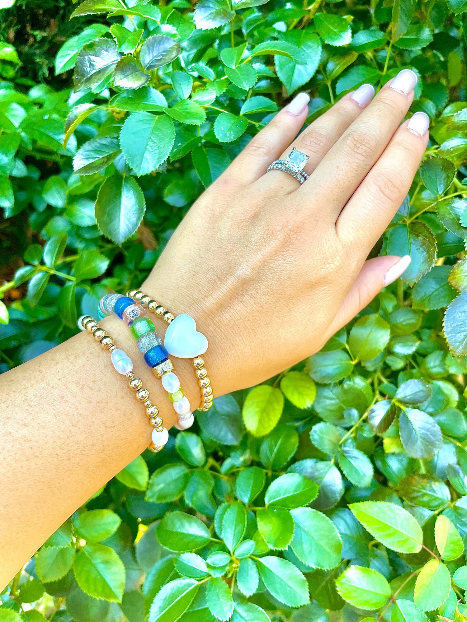 This bracelet is handmade with 14K gold-filled 5MM beads, freshwater pearls, 9MM glass Czech beads, 6MM glass Czech beads, and a gold-filled stardust bead. It is a 6.5" stretch bracelet.