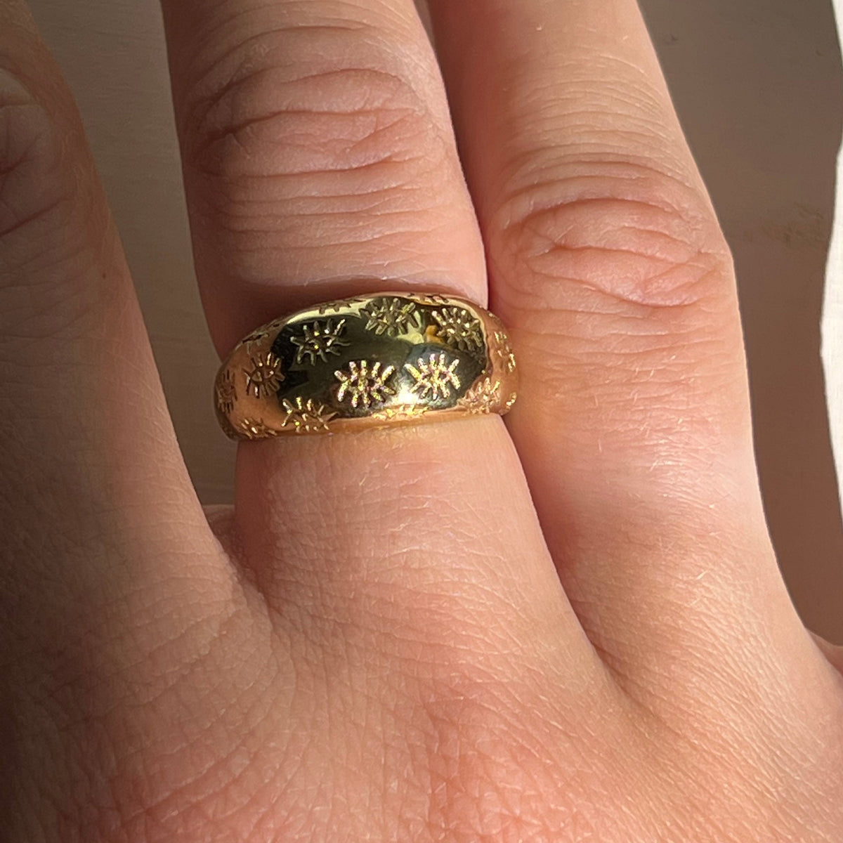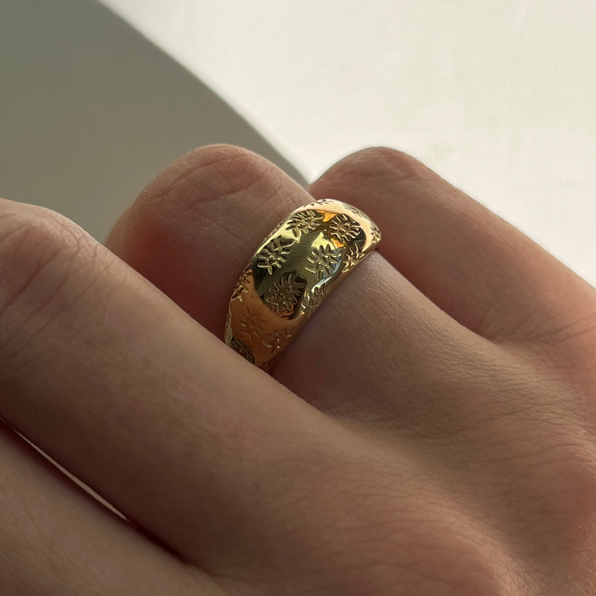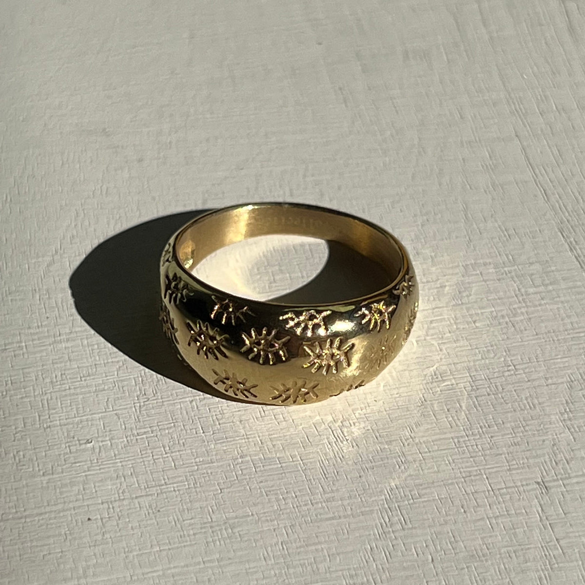 This ring is crafted from tarnish-resistant 22k gold vacuum-plated stainless steel. It is available in sizes 6, 7, and 8.