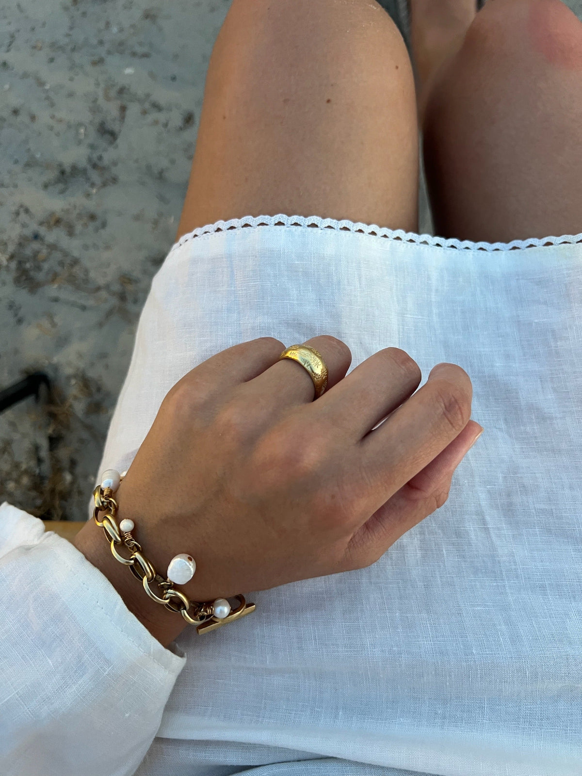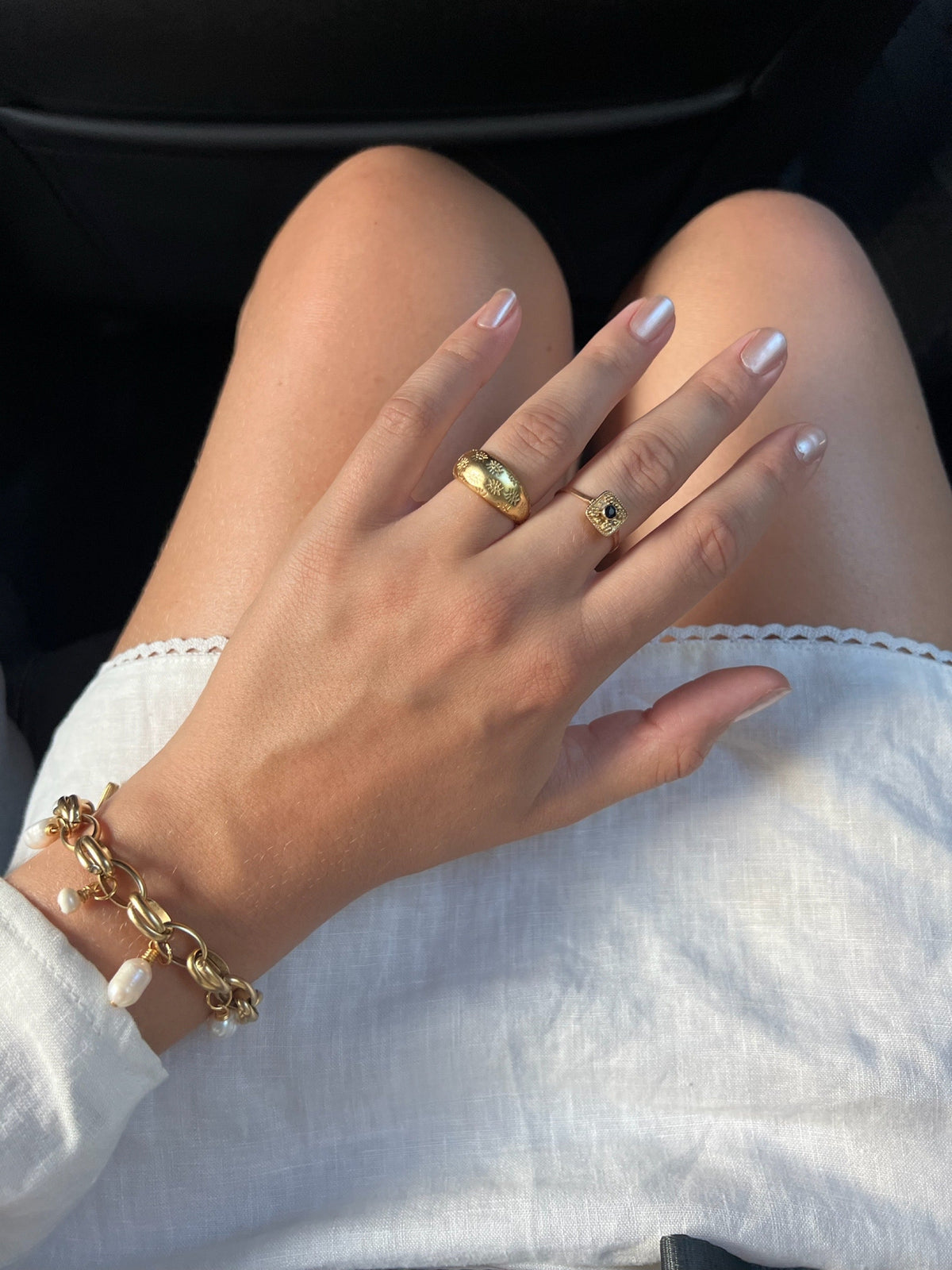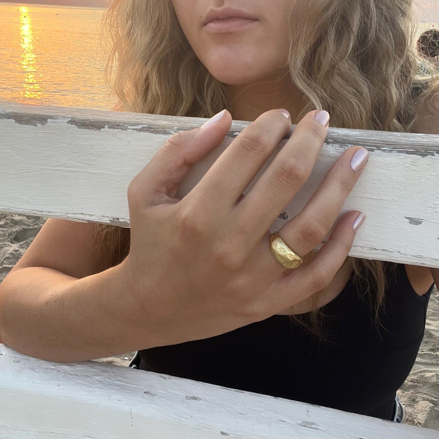 This ring is crafted from tarnish-resistant 22k gold vacuum-plated stainless steel. It is available in sizes 6, 7, and 8.