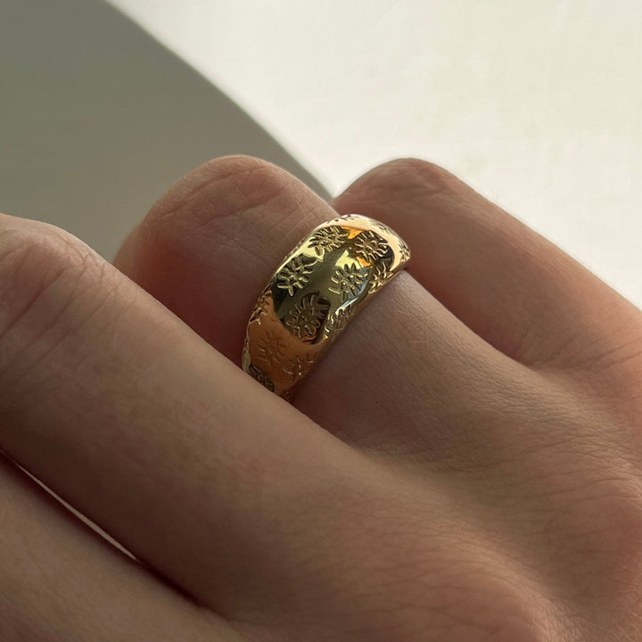 This Sofia Eye Ring by Sccollection is a beautiful chunky gold ring engraved with the drawing that "started it all." The wide band with a thinner backing provides a comfortable fit. Made from tarnish-resistant 22k gold vacuum-plated stainless steel, it is a bold and stylish accessory designed to last.