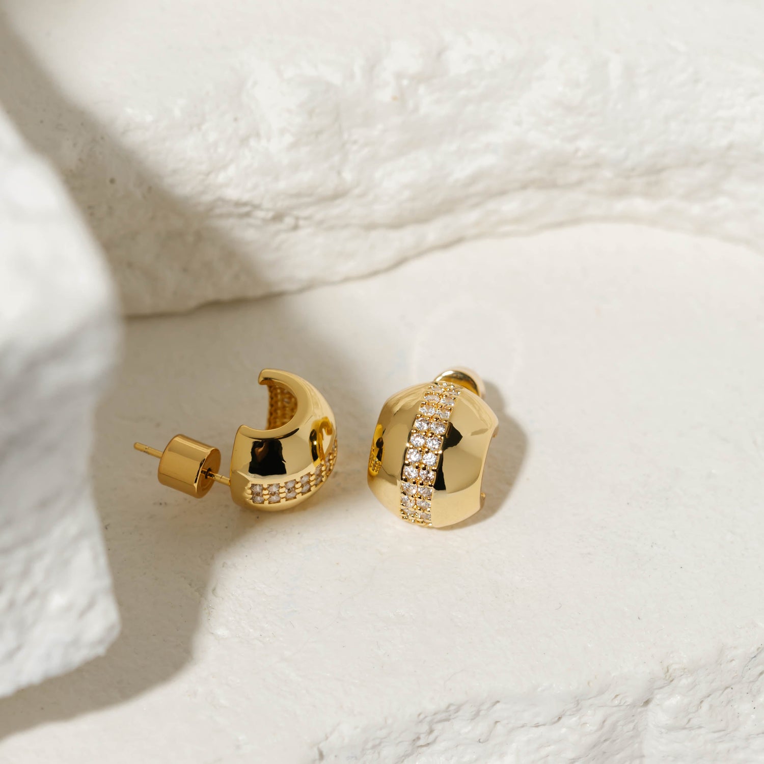 Made with 18K triple-layered gold over brass, meticulously adorned with crystals, and enhanced with a fourth-layer PVD coating. They have a high polish finish.