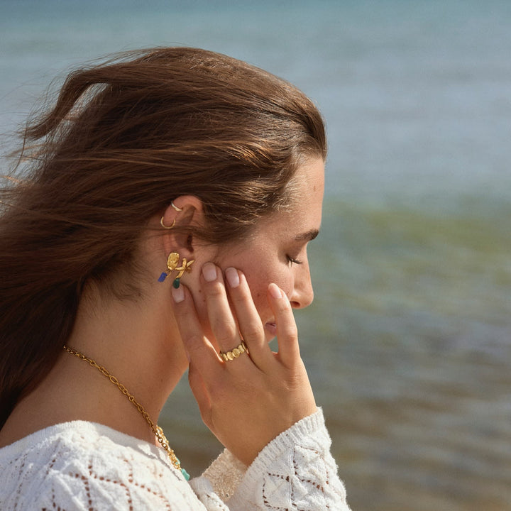 This waterproof, PVD-coated earring is made from 18k gold-plated stainless steel with blue sea glass.
