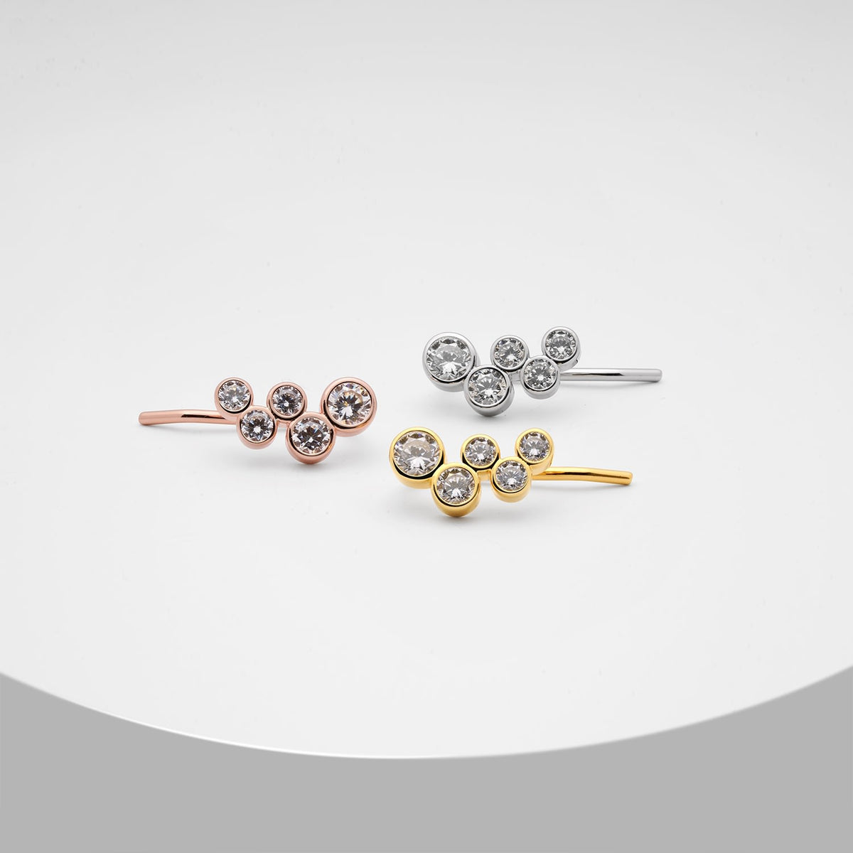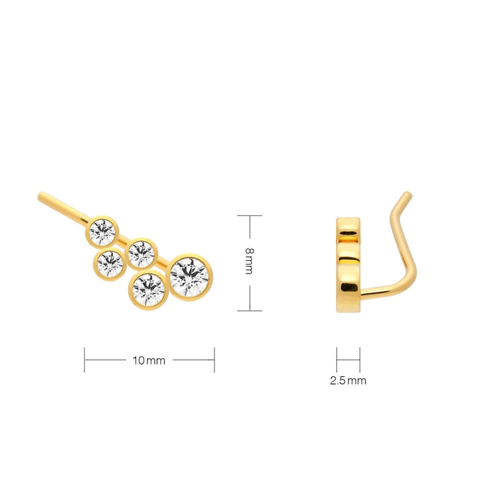 These Clustered Bezel Set Cz Ear Climber Stud Earrings - Silver by Meulien are a picturesque and elegant accessory. They are made from sterling silver and feature a cluster of 5 bezel set clear cubic zirconia (CZ) stones in varying sizes. The design evokes images of delicate flower buds or a constellation of sparkling stars. They are a beautiful eye-catcher, adding a touch of sparkle to your earlobes.