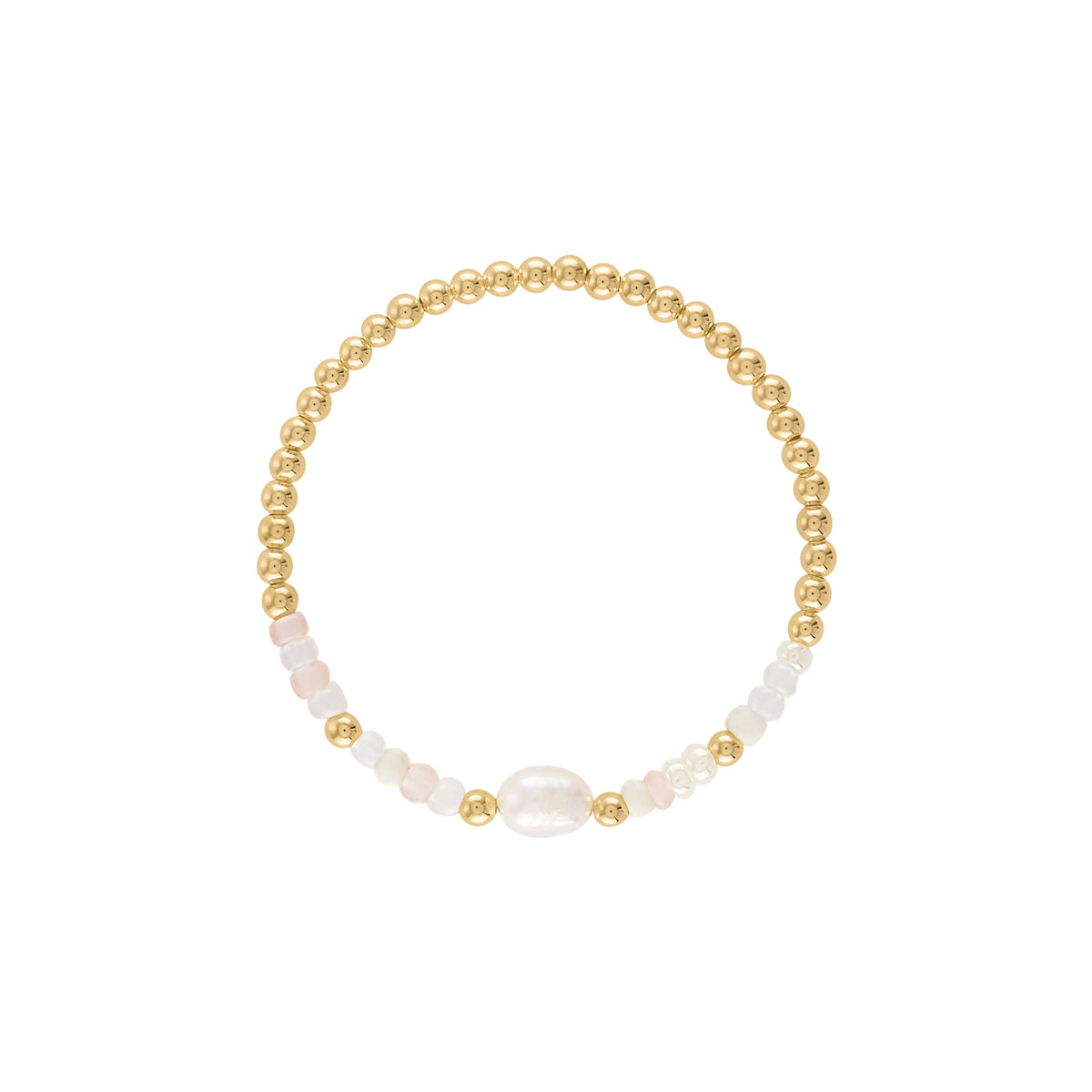 This bracelet is made from 14K gold-filled beads, mother of pearl, and Czech beads. It is available in 6.5" or 7" stretch. To maintain the color, do not sleep, shower, or swim while wearing it.