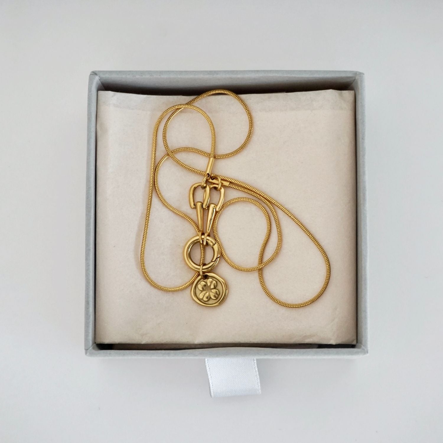 This Lucky Charm Necklace by Third Tone is a beautiful talisman of good fortune and effortless style. The delicate four-leaf clover, reminiscent of a wax stamp, and the horseshoe link are designed to double the luck and attract positivity. Its unique opening clasp allows you to personalize it with other charms, making it a versatile and meaningful piece. This necklace is a stylish and personal way to carry good luck with you every day.