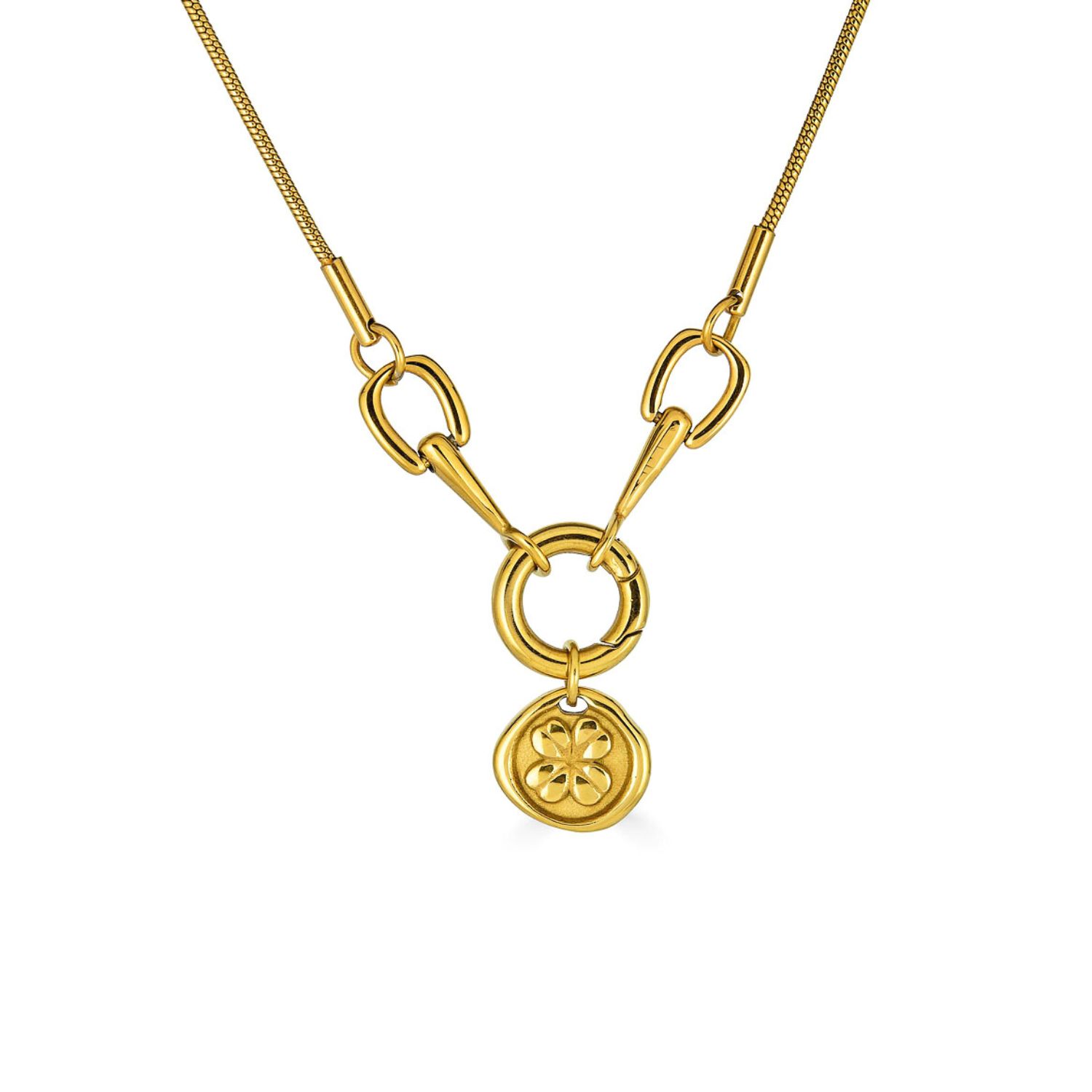 This necklace is crafted from stainless steel with 18K gold plating. It features a four-leaf clover charm and a horseshoe link with an opening clasp.