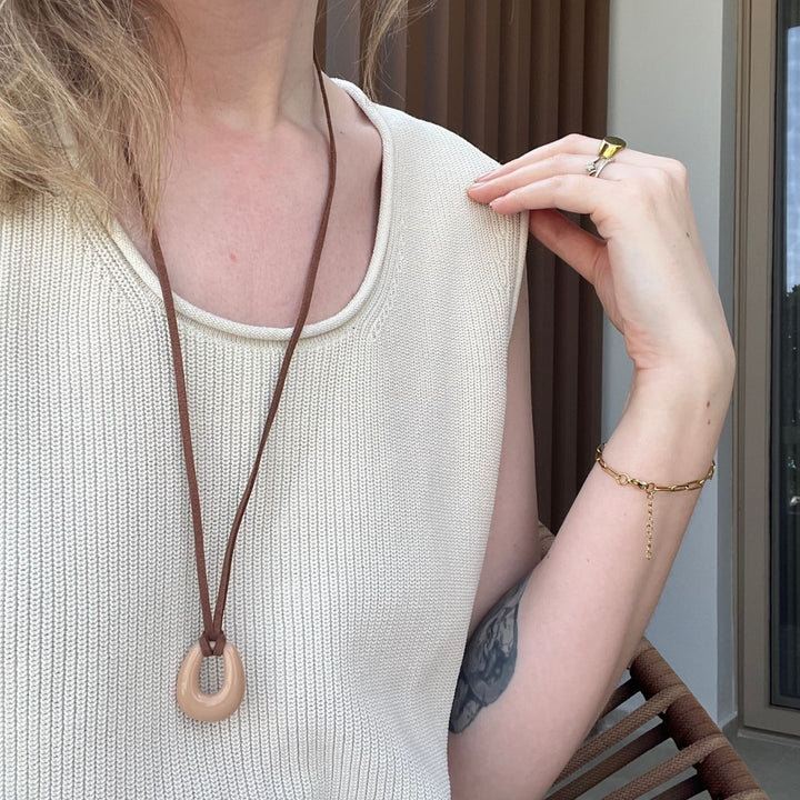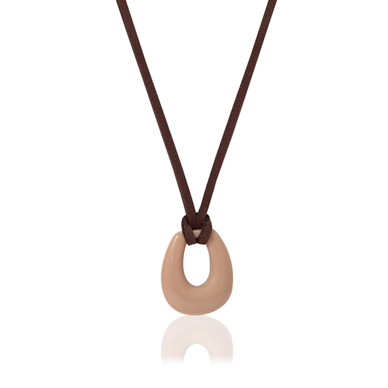 This necklace features a horseshoe pendant crafted from eco-friendly resin and a dark brown suede cord. The cord can be tied to secure.