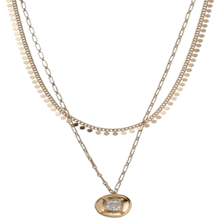 This necklace is made of a gold-colored alloy with a shiny and matte gold finish. It features stone and crystal clear charms. The chains are 15 inches and 12 inches long, and the charm size is 18mm.