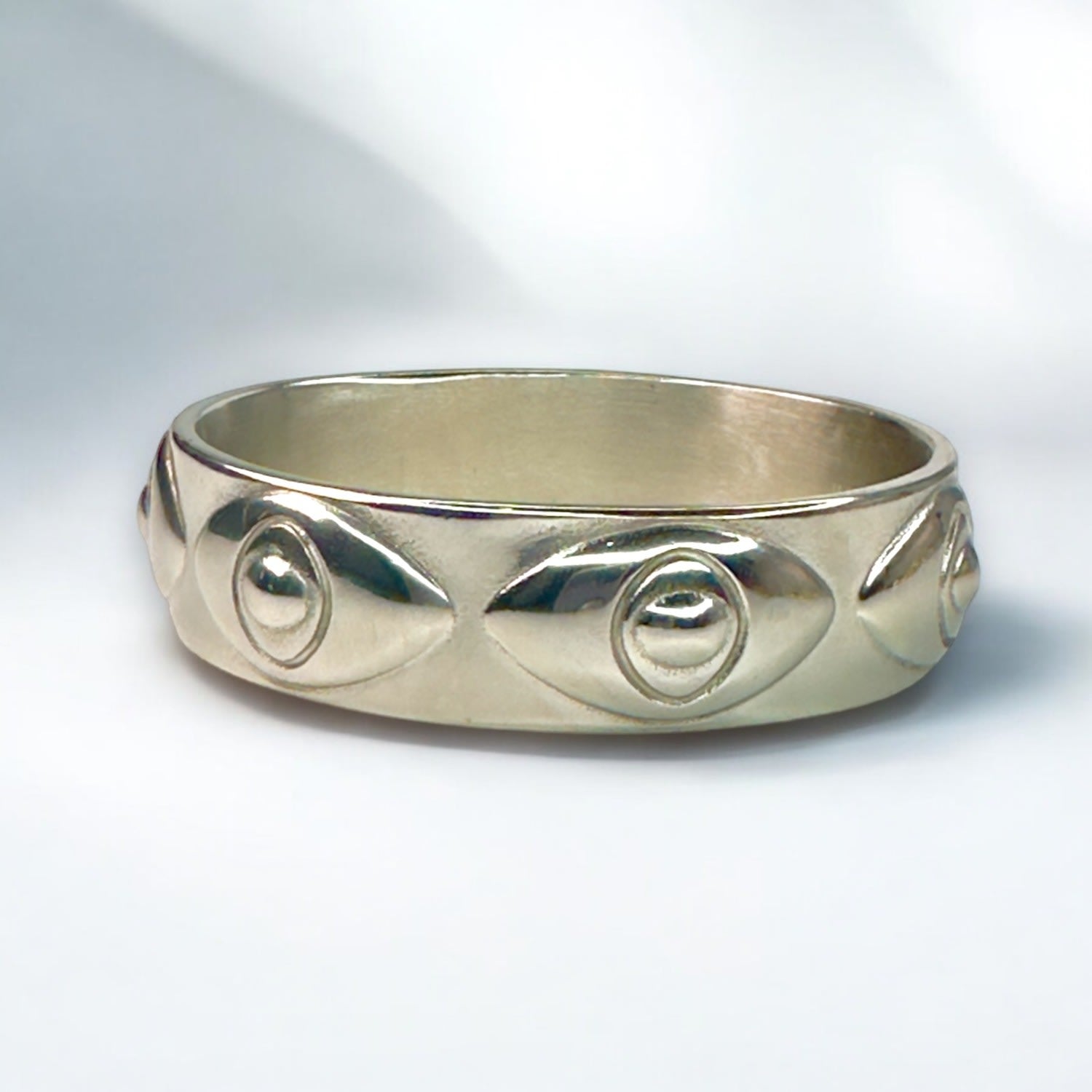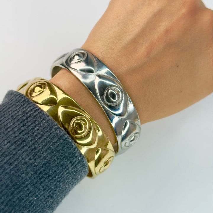 This bangle is crafted from stainless steel with intricately etched evil eye motifs.