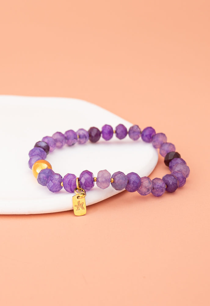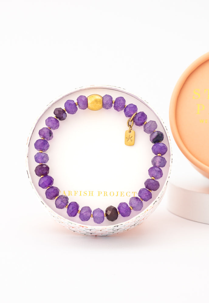 Lan Purple Agate Beaded Bracelet by Starfish Project is a stunning and meaningful piece. Inspired by a survivor named Lan, this bracelet celebrates the beauty and strength of community. The light-reflecting purple agate beads, accented with 14K gold-plated elements, create a beautiful and radiant look. By wearing this bracelet, you are celebrating your community and making an impact by supporting women experiencing freedom and independence.