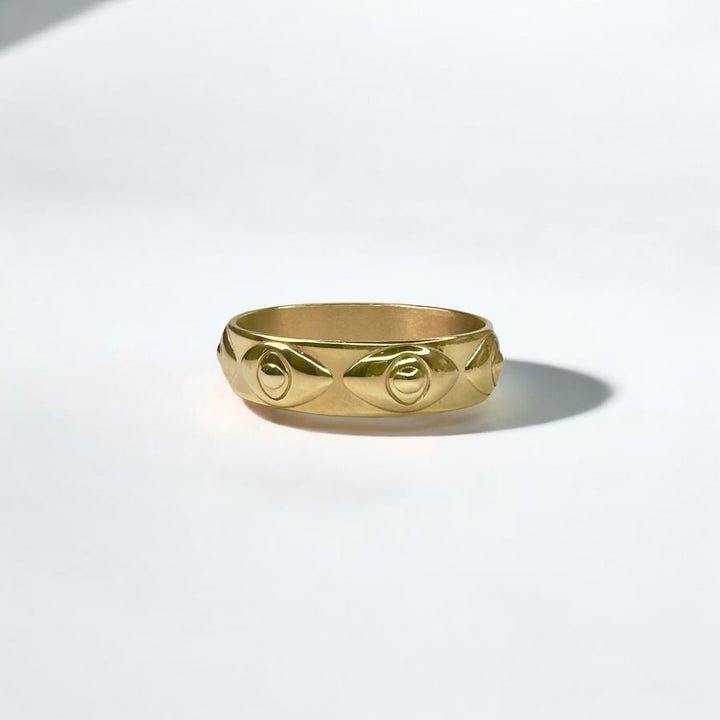 This bangle is crafted from stainless steel and features intricately etched evil eye motifs.