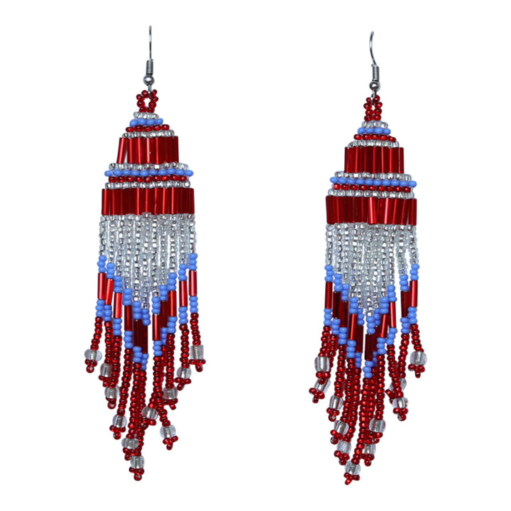 These Encuentro Beaded Boho Earrings - Lady In Red by Good Tidings Style are a beautiful and spirited accessory with a rich, handmade feel. Inspired by the Navajo tribe, the intricate beadwork and sterling silver and brass accents create a bohemian-chic look. The vibrant red hue adds a touch of passion and confident flair.