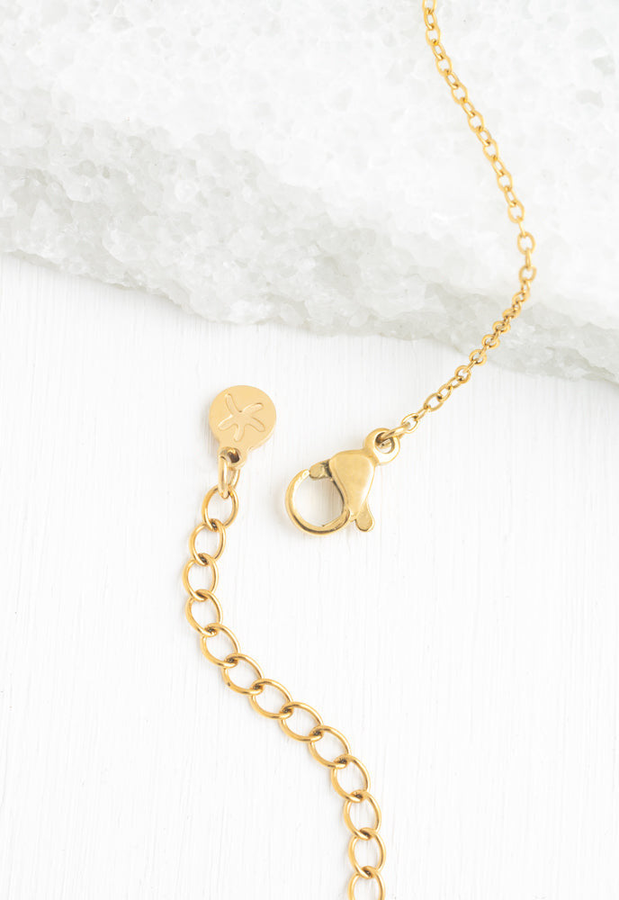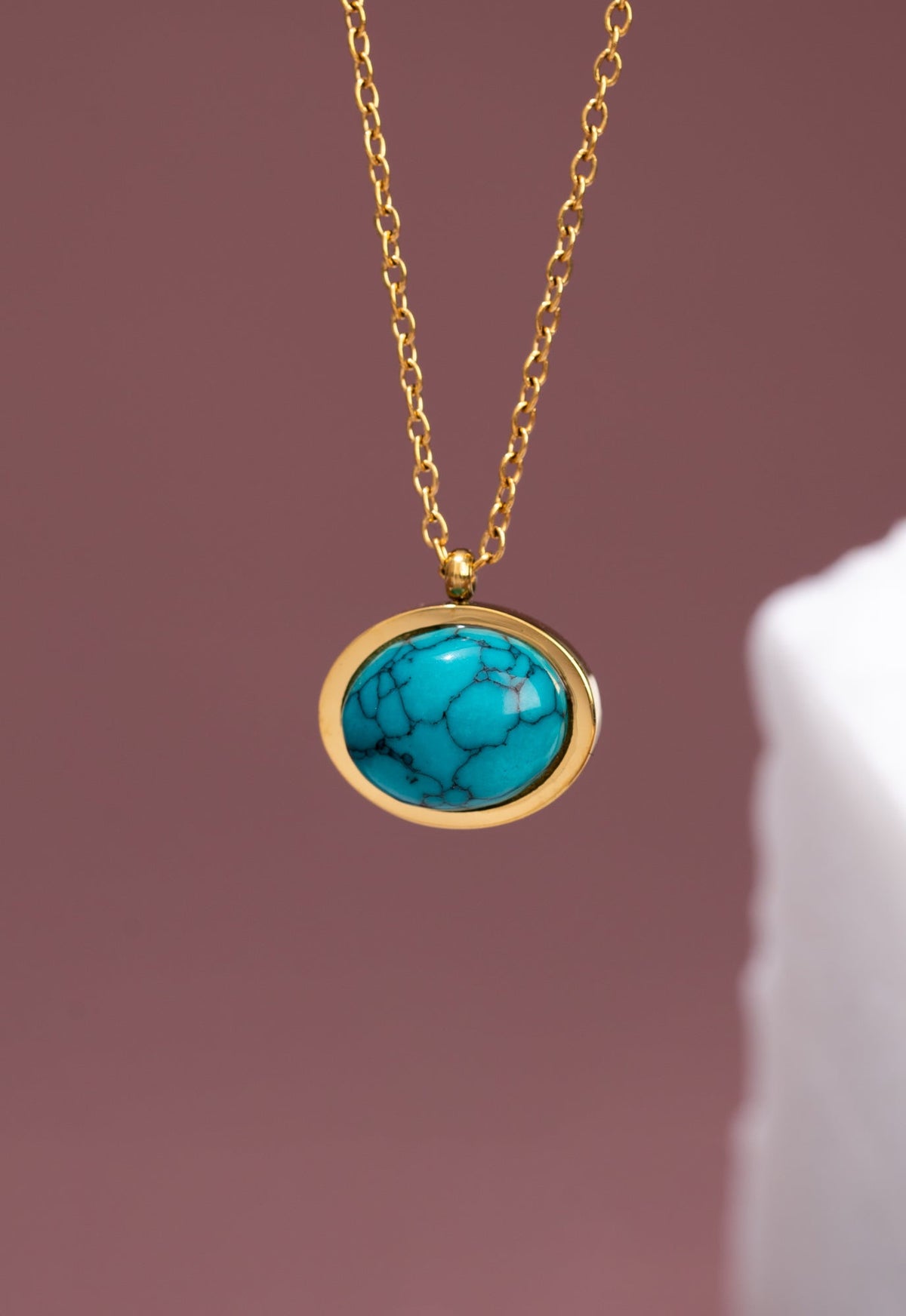 This necklace is crafted from 14k gold plated stainless steel and features a turquoise stone. It is hypoallergenic, lead and cadmium free, and has an adjustable chain.