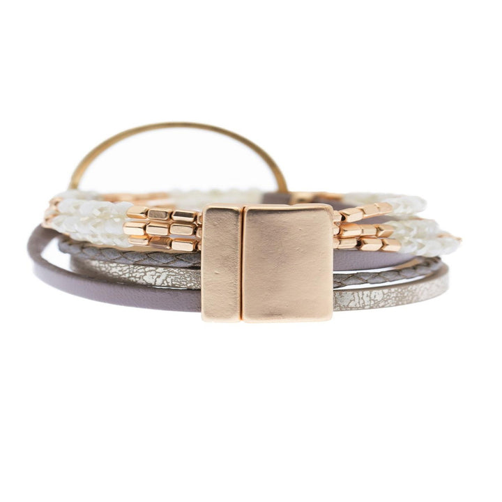 This Leather Beaded Crystal Circle White Bracelet by Saachi is an effortlessly beautiful accessory that combines natural texture with glamorous sparkle. The elegant strands of genuine leather and shimmering acrylic beads are centered around a metal circle lined with sparkling crystals. The magnetic clasp makes it easy to put on and take off, offering both style and convenience for any occasion.