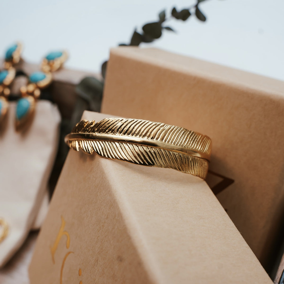 The Asmin Cuffs by Rōz are a unique and versatile accessory. The palm leaf-designed cuff is both adjustable and delicate, perfect for stacking with other pieces or wearing on its own as a standalone statement. Its 21k gold plating adds a luxurious finish to this beautiful piece.