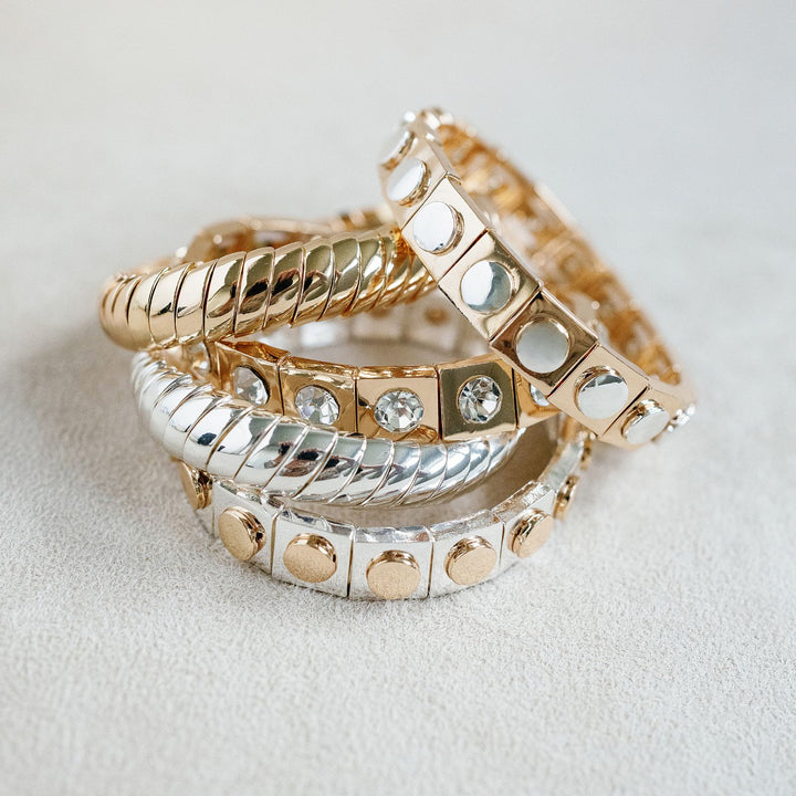 The Geometric Bracelet - Gold by Smith & Co. Jewel Design is a unique and versatile accessory. This two-toned stretch bracelet features a unique stud design and is made to mix and match with other bracelets. It is water resistant and has a one-size-fits-all style that is easy to put on and take off. It is made with enamel and is a great addition to any bracelet stack.