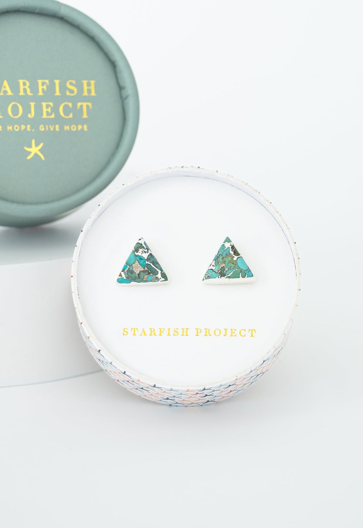 The Ellie Triangle Turquoise Studs In Sterling Silver by Starfish Project feature natural turquoise stones woven together and lovingly wrapped in shining sterling silver. The natural stones and playful triangle shape create a combination of organic and modern style. These studs are a beautiful accessory that also supports a good cause.