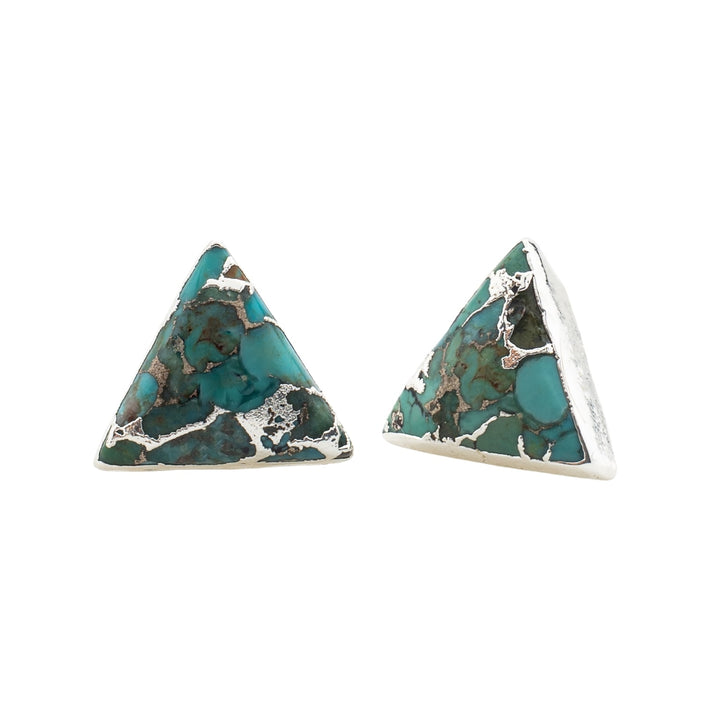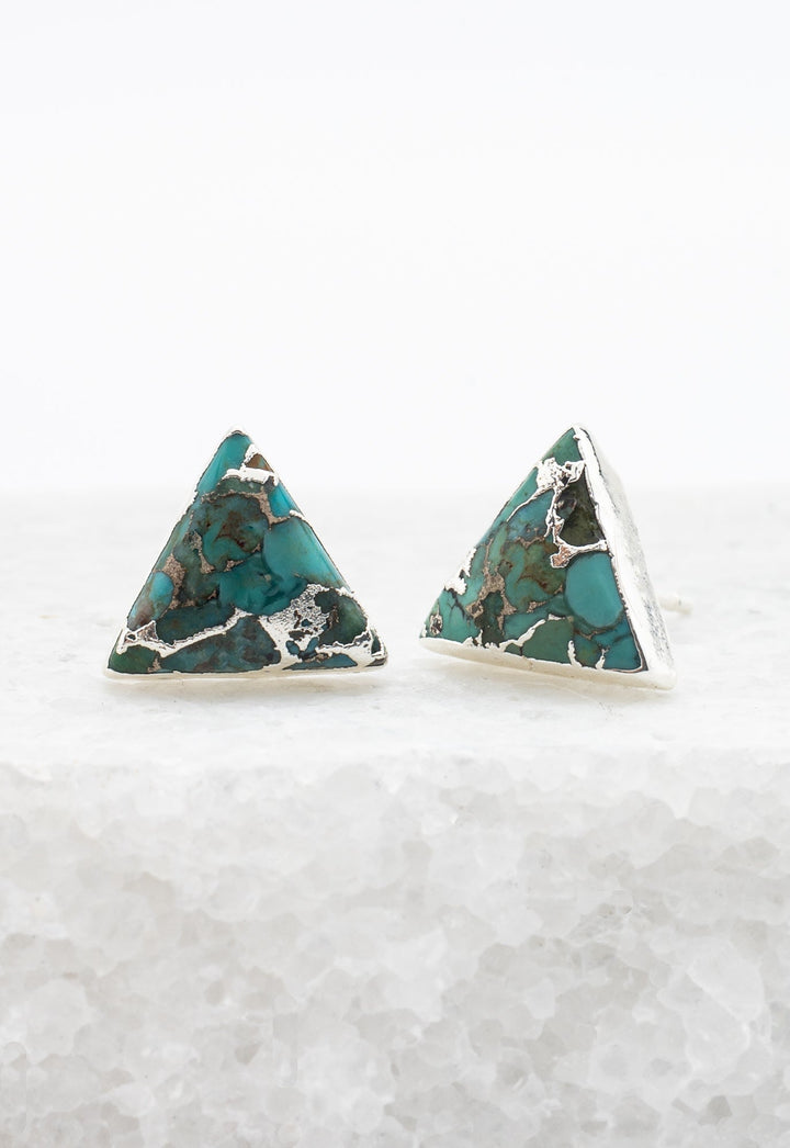 These studs are made from silver plated natural turquoise and are hypoallergenic. They feature a unique triangle shape.