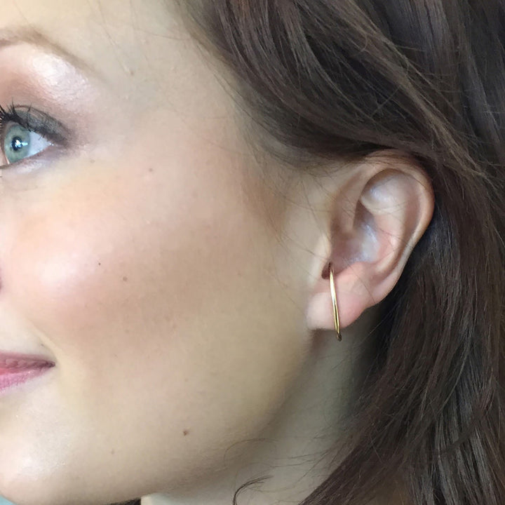 These Suspension Hoops by Glamrocks Jewelry offer a new and artistic illusion. The curved bar posts wrap and disappear into the ear, creating a modern and eye-catching design. They are a set of two earrings that can be carefully squeezed to adjust the fit. These hoops are perfect for those who want a unique and minimalist statement piece.