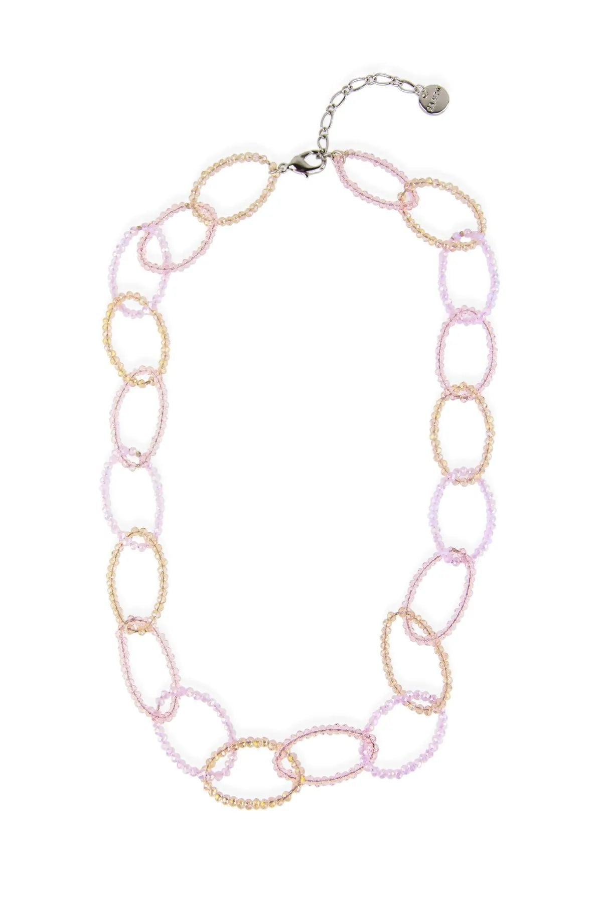 This necklace is a crystal-linked piece with a lobster clasp, measuring 22 inches with a 2-inch extender.