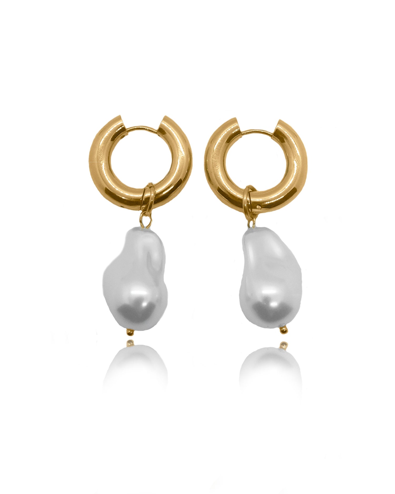 These dangle drop earrings are made from high-quality 18k gold-plated stainless steel. They feature removable baroque-style pearls. They are hypoallergenic, waterproof, and non-tarnish.
