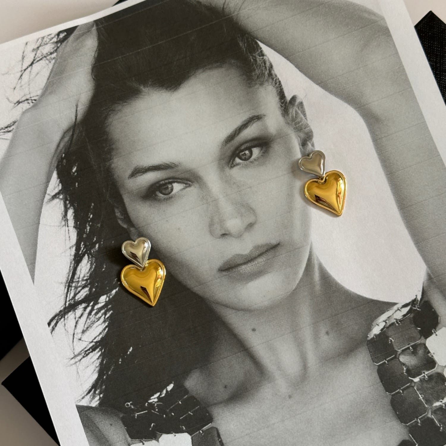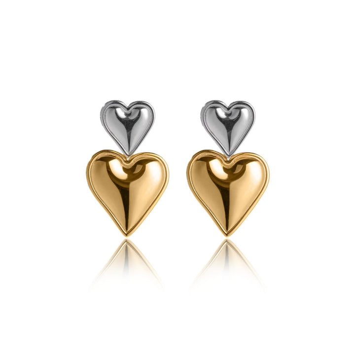 These earrings are crafted from stainless steel with 18k gold & silver coating. They are hypoallergenic, waterproof, and non-tarnish, with a small silver heart on a large gold heart.