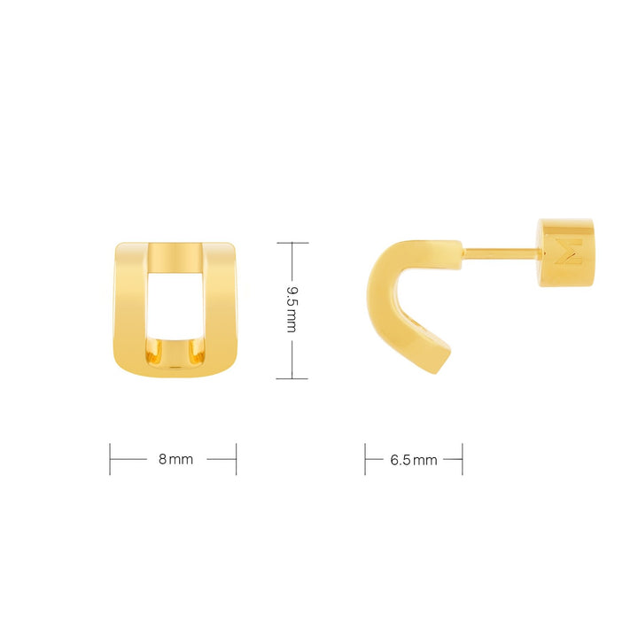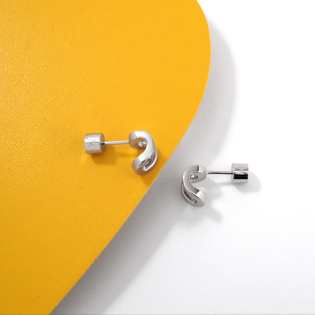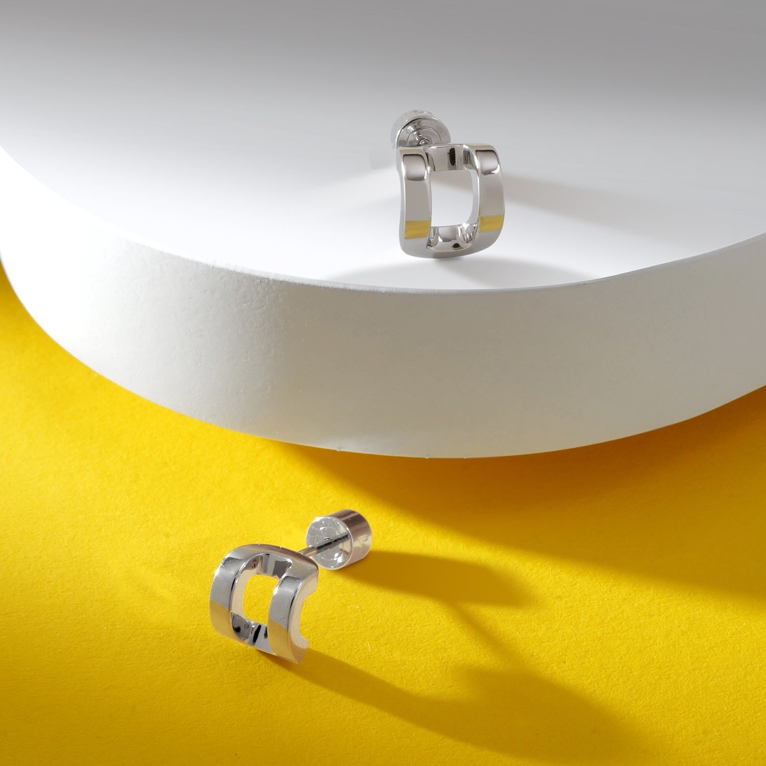 These stud earrings are made from sterling silver. They feature a curved, hollow rectangle shape.