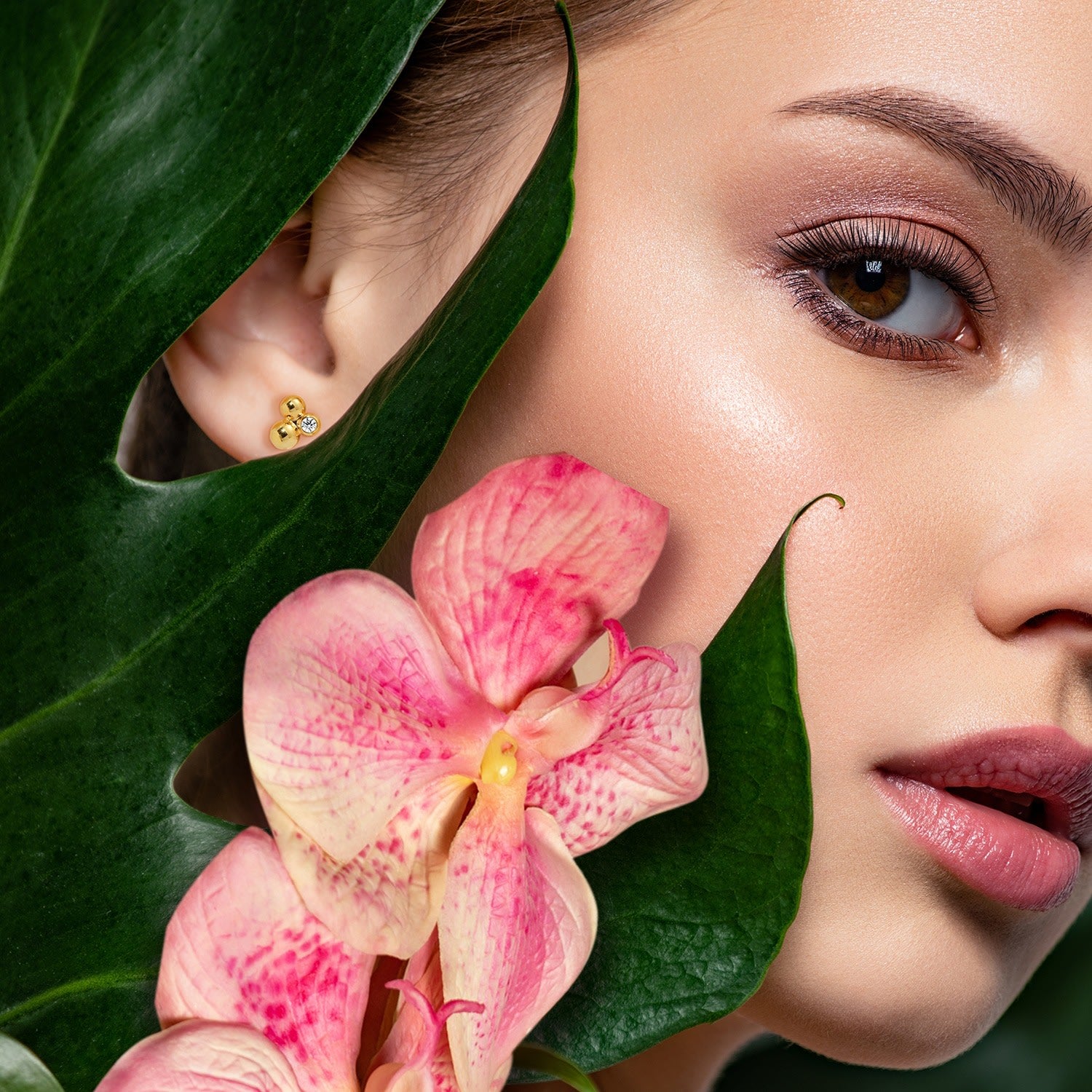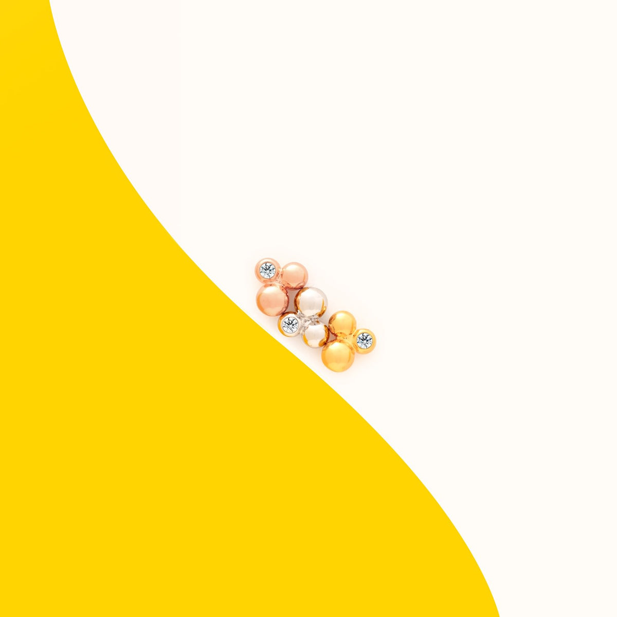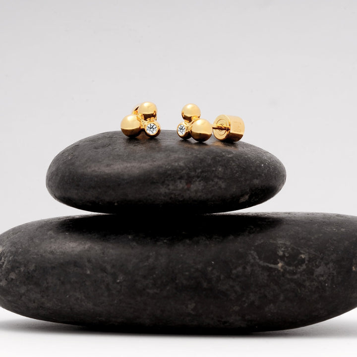 These stud earrings are made from 18K vermeil and feature a cluster of spheres. The smallest ball is bezel-set with a clear round cubic zirconia stone.
