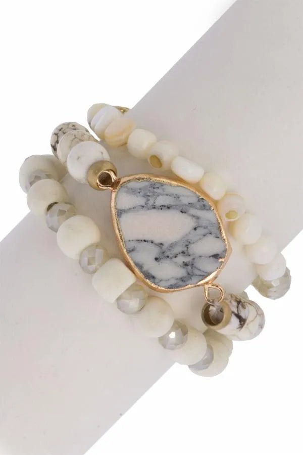 This set includes three stretch bracelets with a 2.5-inch diameter. They are made with white stones, glass beads, and gold charms, with a marbled stone centerpiece on one bracelet.