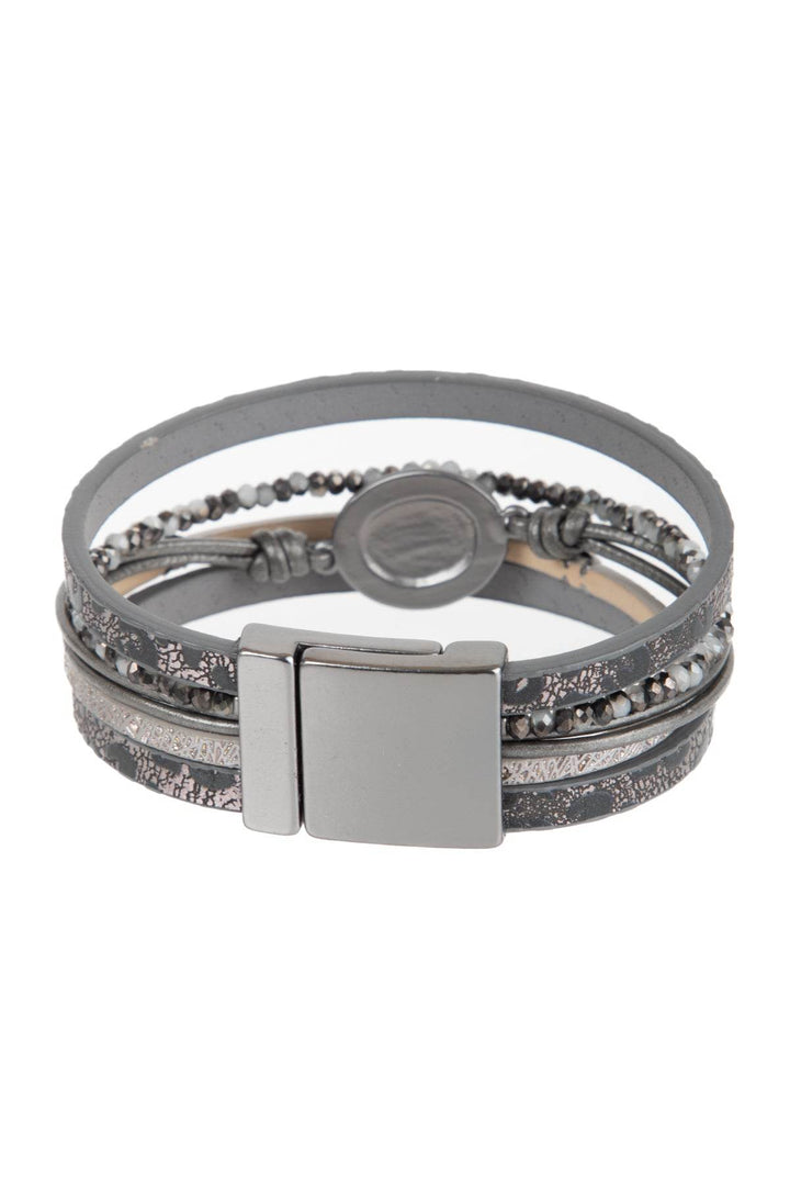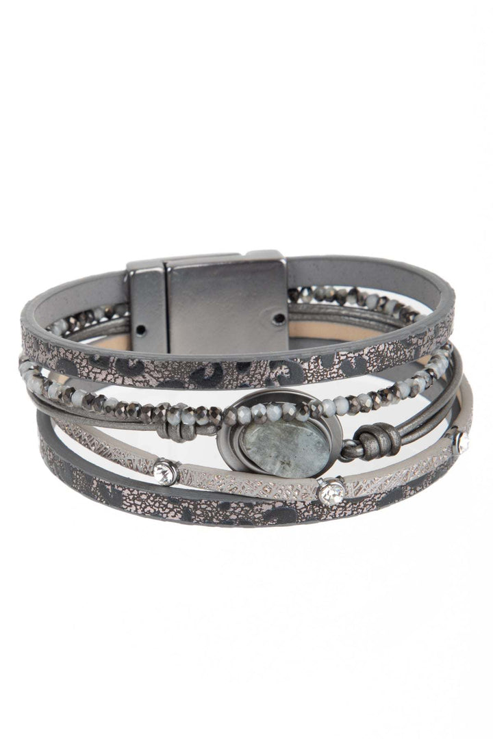 This imported bracelet is made of real and vegan leather, zinc alloy, natural stone, and crystal.