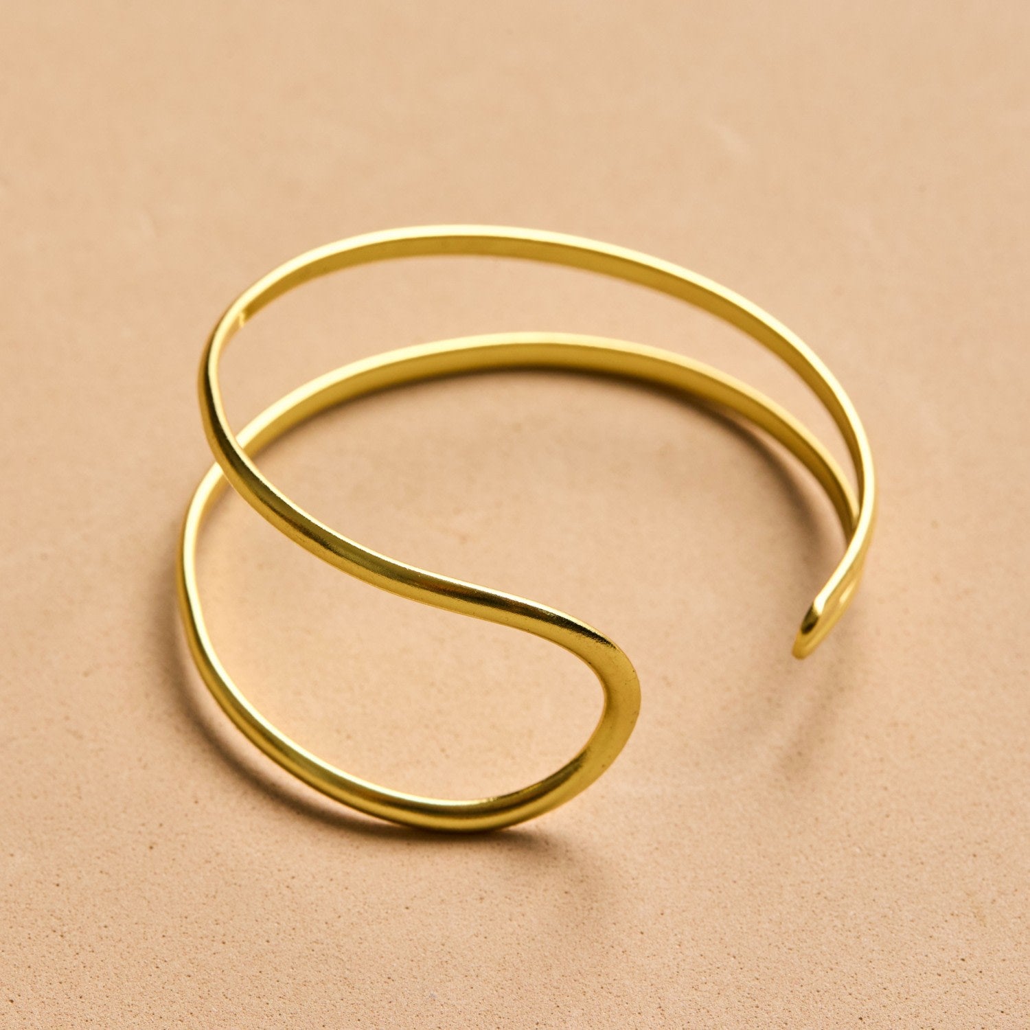 This cuff is made from brass metal with a 21-karat gold-plated lacquer coating. It is handmade and adjustable.