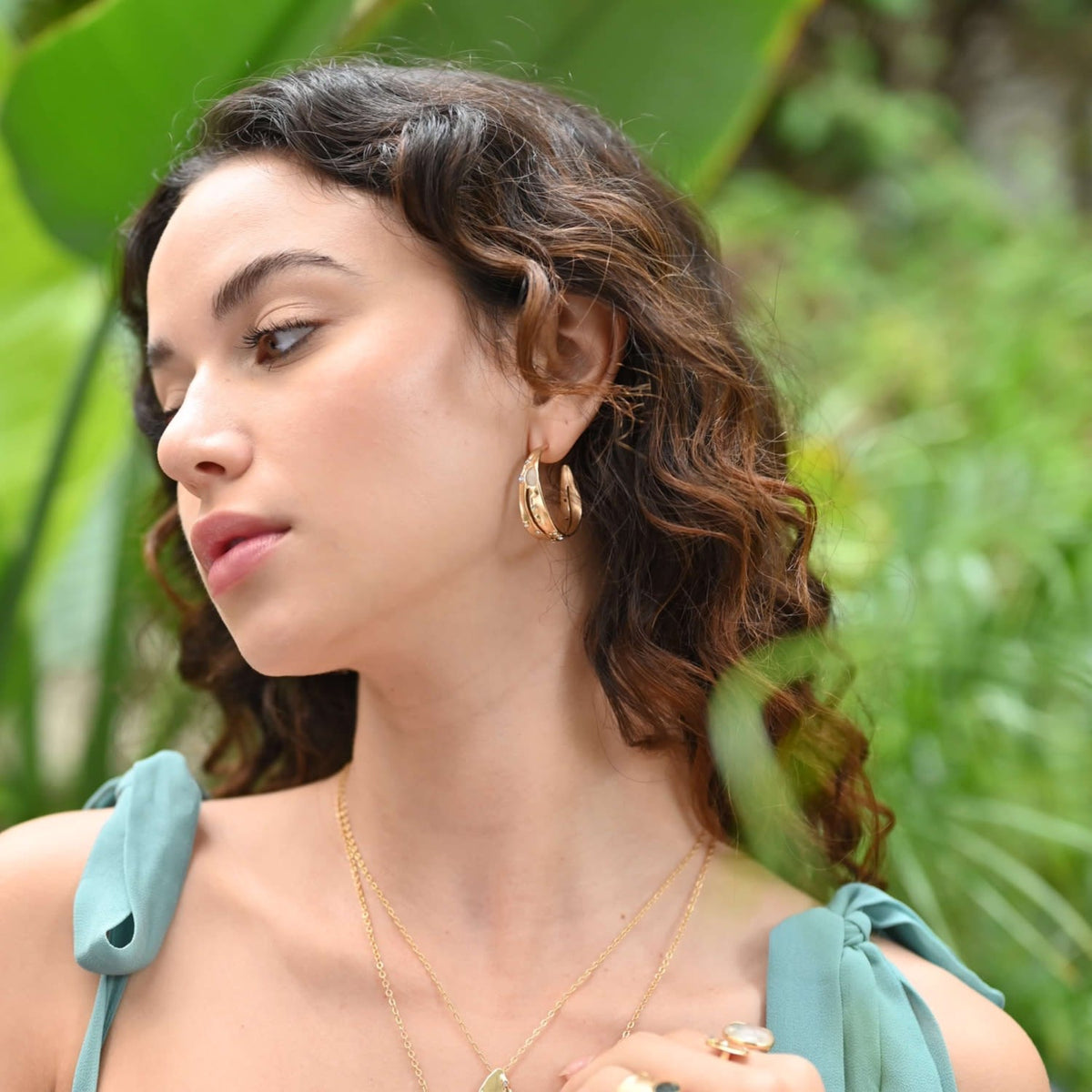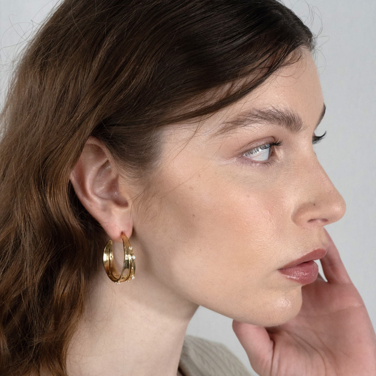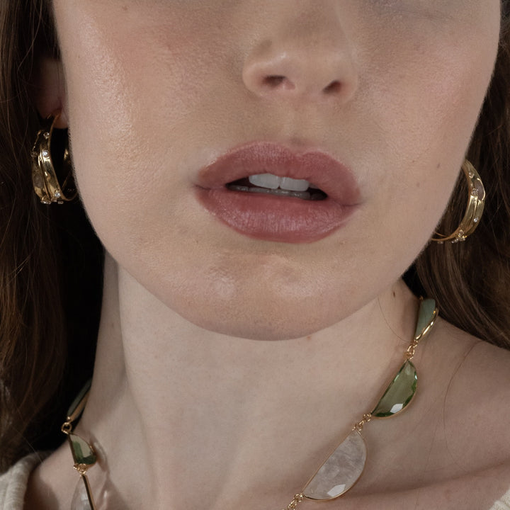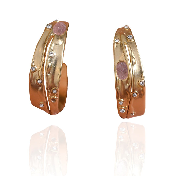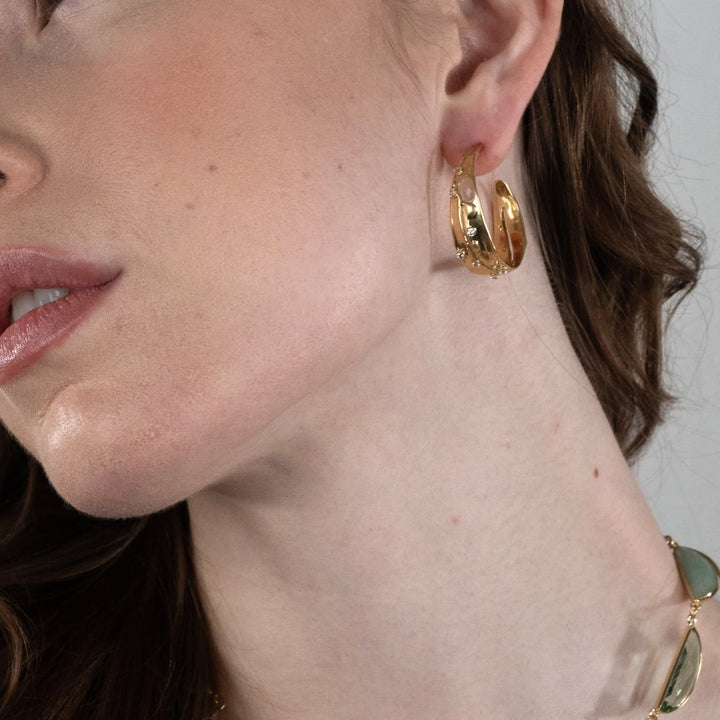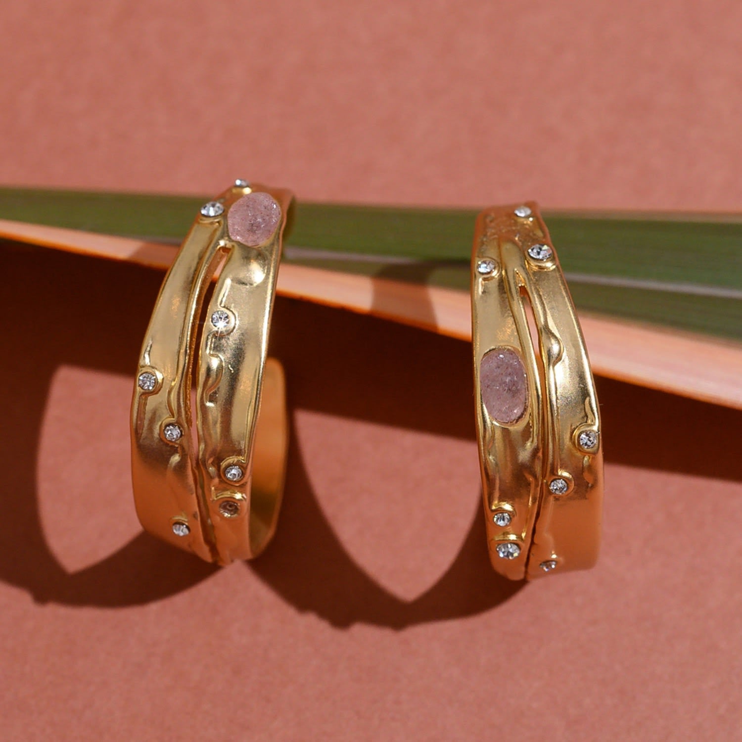 These Sprinkled Pink Stones Hoop Earrings by Rare Matters Jewelry are an ode to the beauty in imperfection. Embracing the spirit of 'wabi-sabi,' their organic, asymmetrical shape is thoughtfully embellished with soft strawberry quartz and delicate sparkles. They offer an understated yet captivating touch of elegance, perfect for those who appreciate unique and meaningful accessories. These earrings embody a sense of serene beauty and effortless charm, designed to reflect the art of finding perfection in the imperfect.