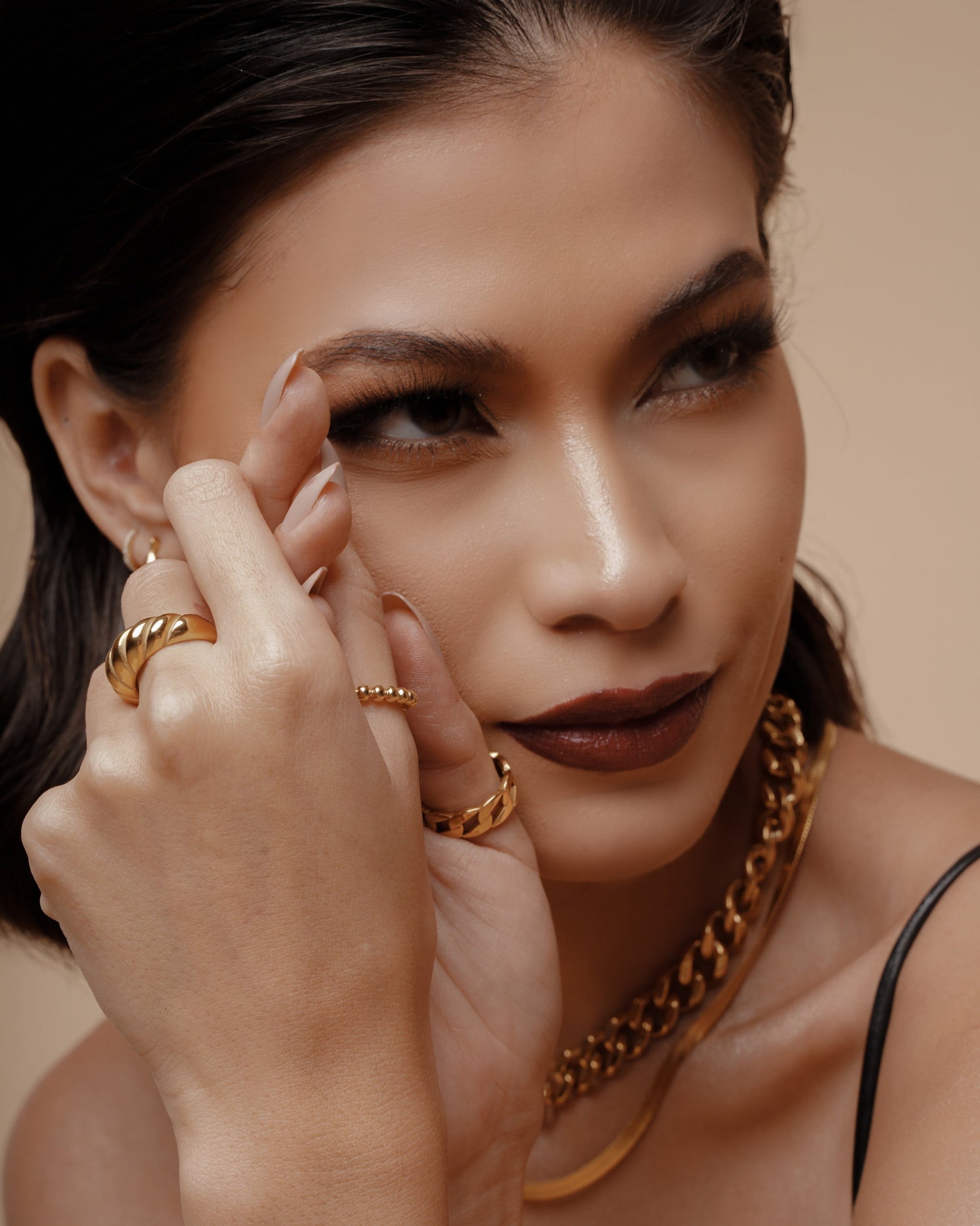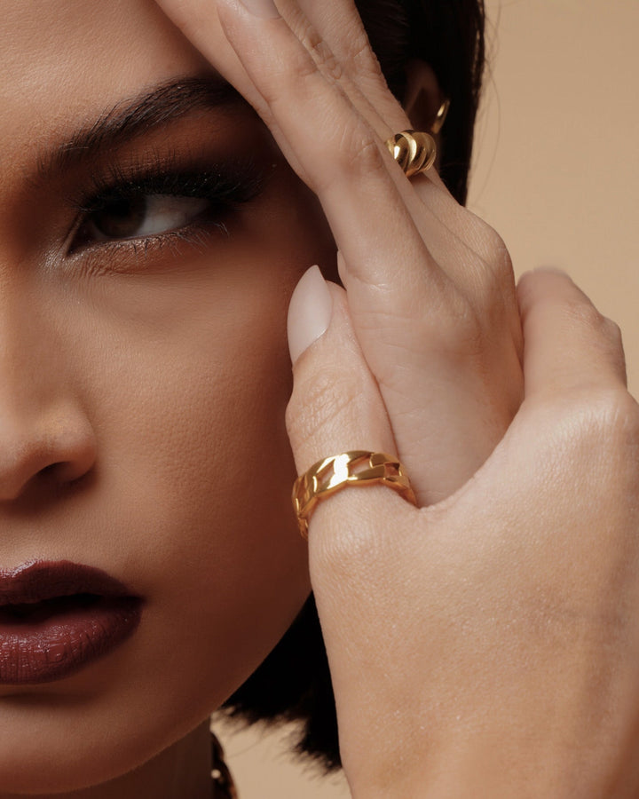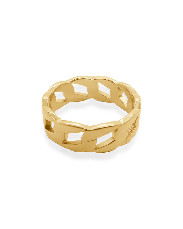 This Kalani Cuban Chain Inspired Ring by Viea transforms a bold Cuban link into a sleek, sculptural band. Clean-cut and textured, it brings a contemporary edge to any look. A modern statement ring designed for everyday wear with lasting polish.