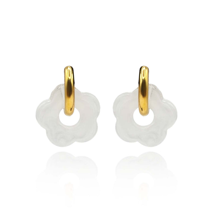 This piece is a classic gold hoop with a frosted resin floral drop. To clean, use a dry cloth and avoid contact with water and cosmetics.