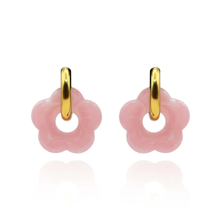 Rose Quartz Resin Floral Drops On Gold Hoops