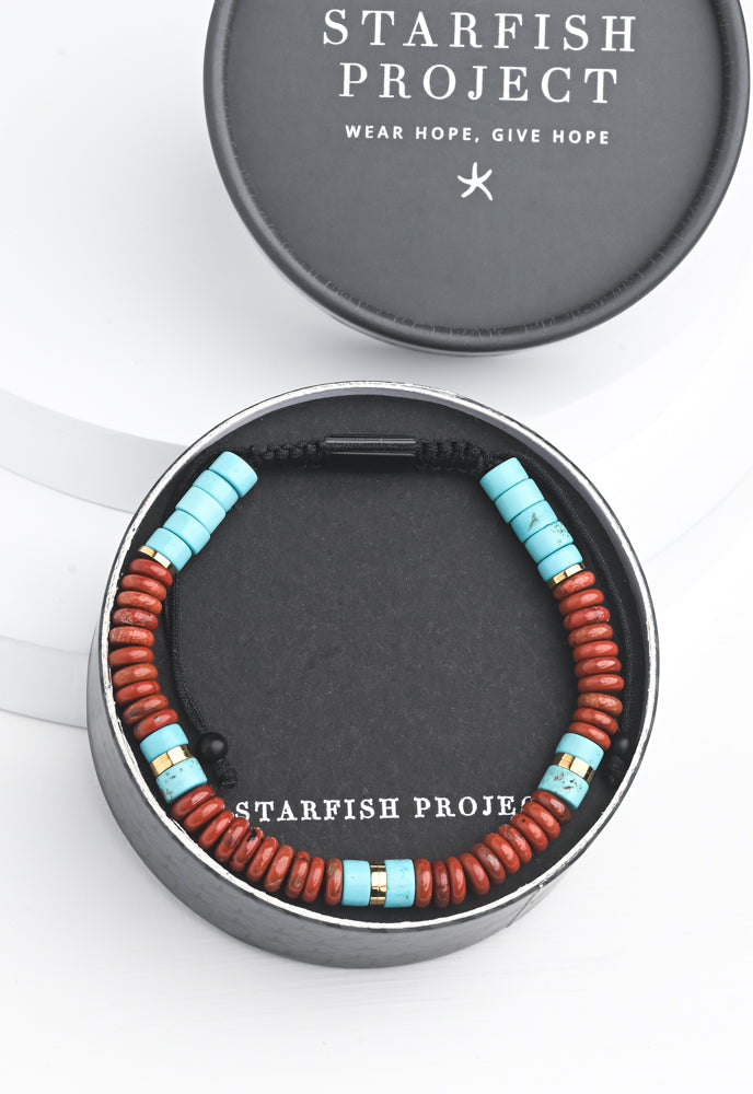 Aang Turquoise & Red Jasper Rope Beaded Bracelet by Starfish Project is a laid-back yet stylish accessory with a deeper purpose. This unique piece features a collection of one-of-a-kind turquoise and red jasper stones, hand-beaded on a reinforced cord with an adjustable pull clasp. It is designed to be a versatile styling option for a relaxed look while symbolizing a step toward independence and a dignified career for survivors of human trafficking.