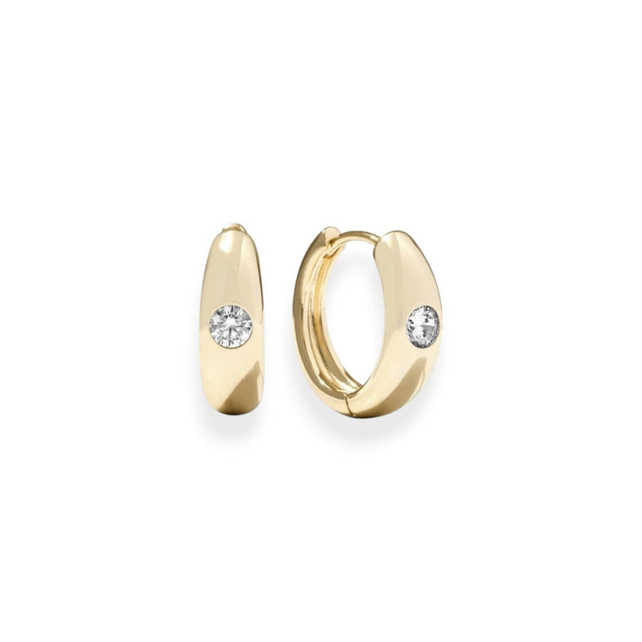 These huggie hoops are crafted from 14k gold-filled brass and feature a single bezel-set cubic zirconia. They have a sleek, tapered design.