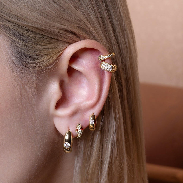 These Eos Chunky Huggie Hoops by Alexie of Athens are a study in timeless simplicity. With a sleek, tapered design, these huggies feature a single bezel-set cubic zirconia that catches the light beautifully. They are perfect for everyday wear or a subtle statement, sitting off the ear with a clean, polished look that transitions seamlessly from day to night.