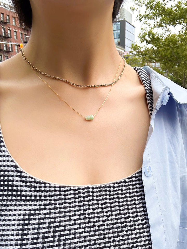 This necklace features a pendant made of natural, untreated jadeite, which is 5mm x 8mm x 8mm. The adjustable chain is gold-plated S925 sterling silver and has a length of 400-450mm.