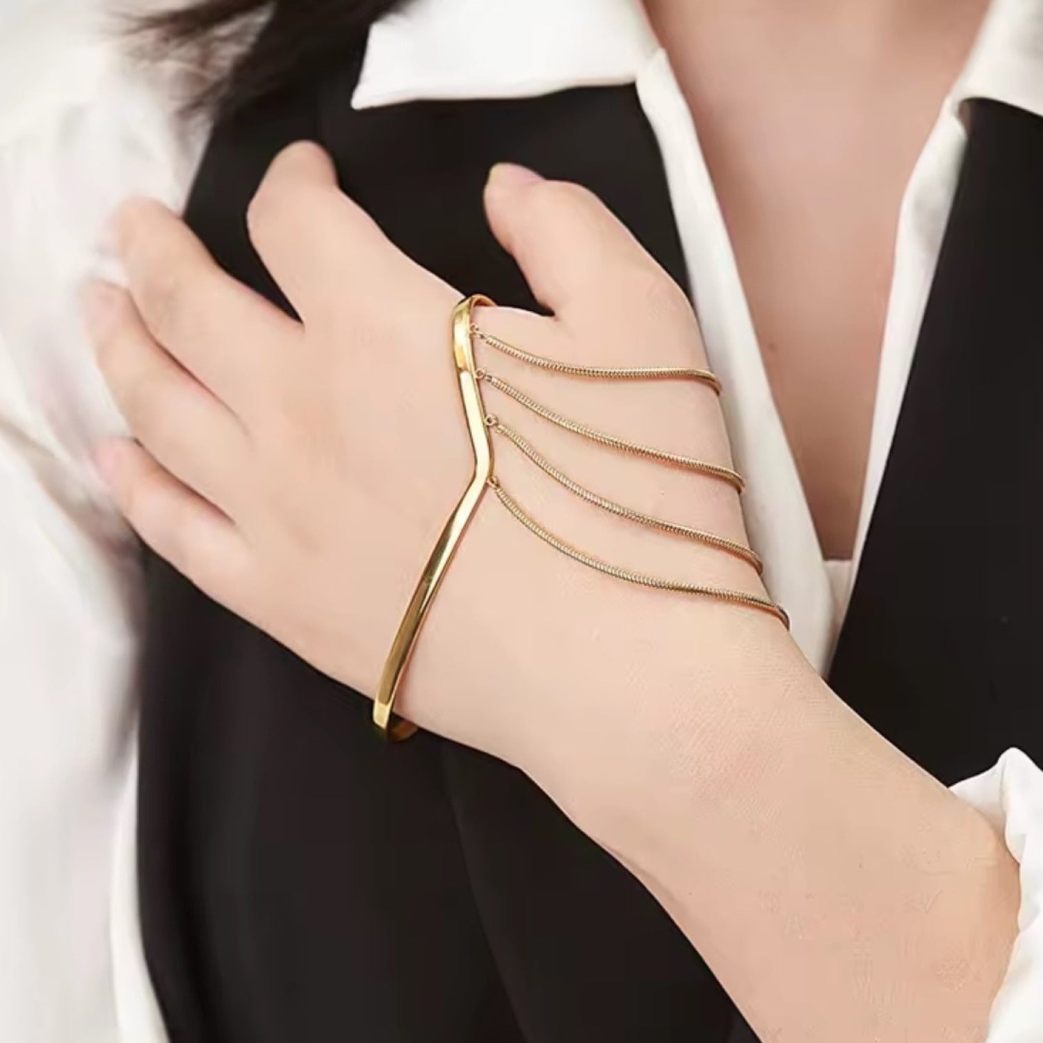 This Palm Fringe Cuff Bracelet by Babaloo Jewelry is a modern masterpiece. This cuff bracelet features a minimalist open cuff silhouette adorned with delicate dangling chains, which adds a dynamic touch to your style. Lightweight and comfortable, it exudes elegance while remaining versatile. Wear it to make a bold, stylish impression with every gesture.