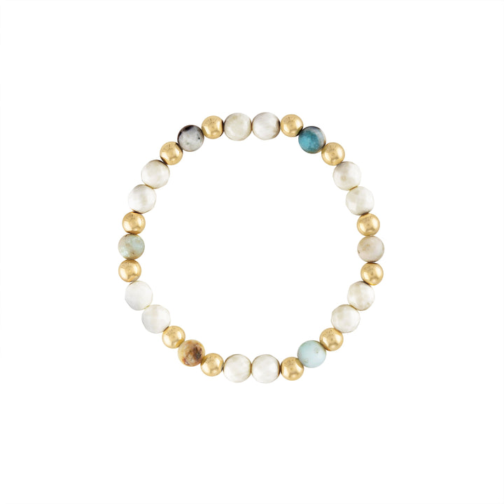 This stretch bracelet is handmade with 14K gold-filled 5mm beads, 6mm white bamboo coral stones, and 6mm amazonite stones. It is available in 6.5" or 7" lengths.