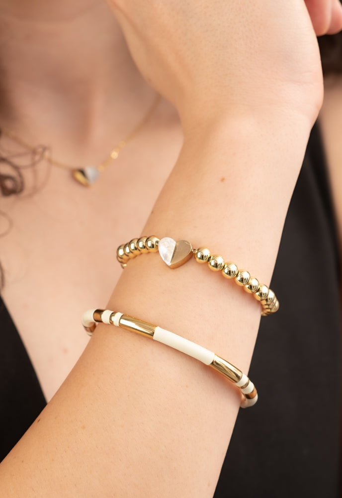 This bracelet features 18k gold-plated brass beads with a mother-of-pearl pendant. It is hypoallergenic, lead and cadmium-free with nickel content less than 100 ppm, and measures 8 inches in size.