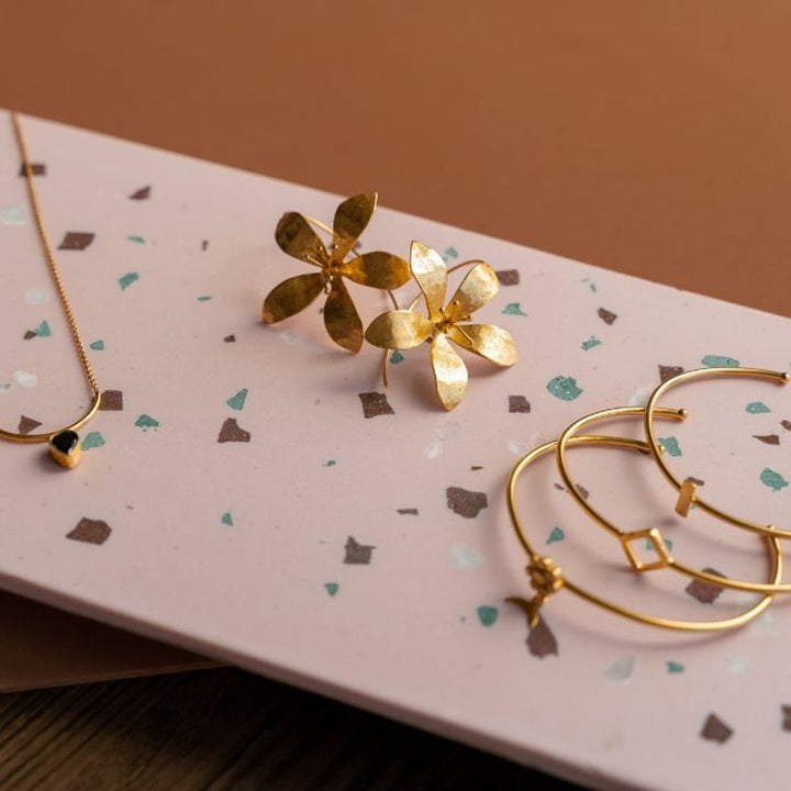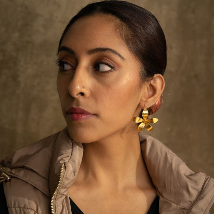 Crafted from brass metal with a 21-karat gold-plated finish, these earrings are coated with a protective lacquer. They are designed to be worn without a stopper.