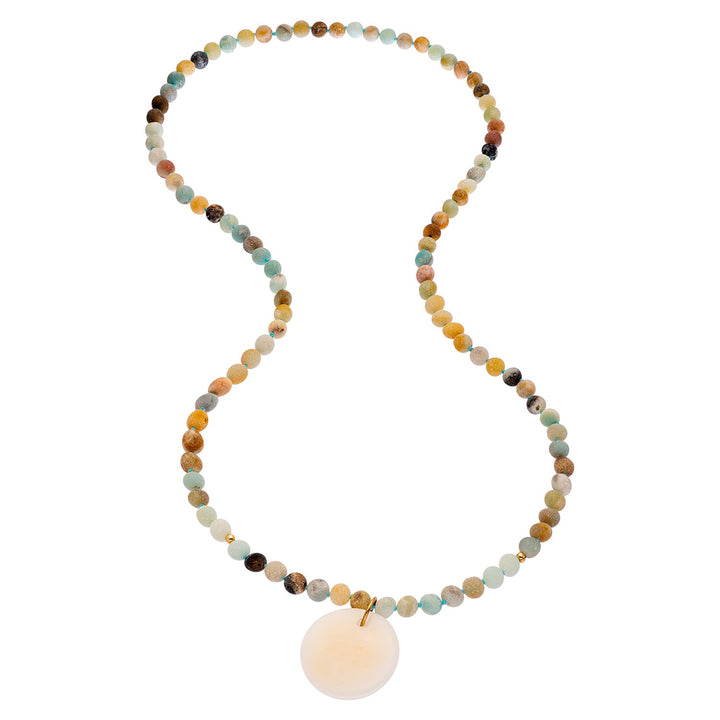 Rockabye Long Coin Beaded Gemstone Necklace - Matte Amazonite - White Jade Coin