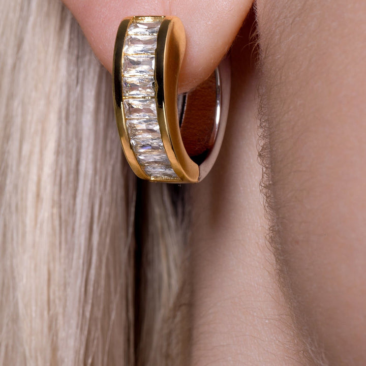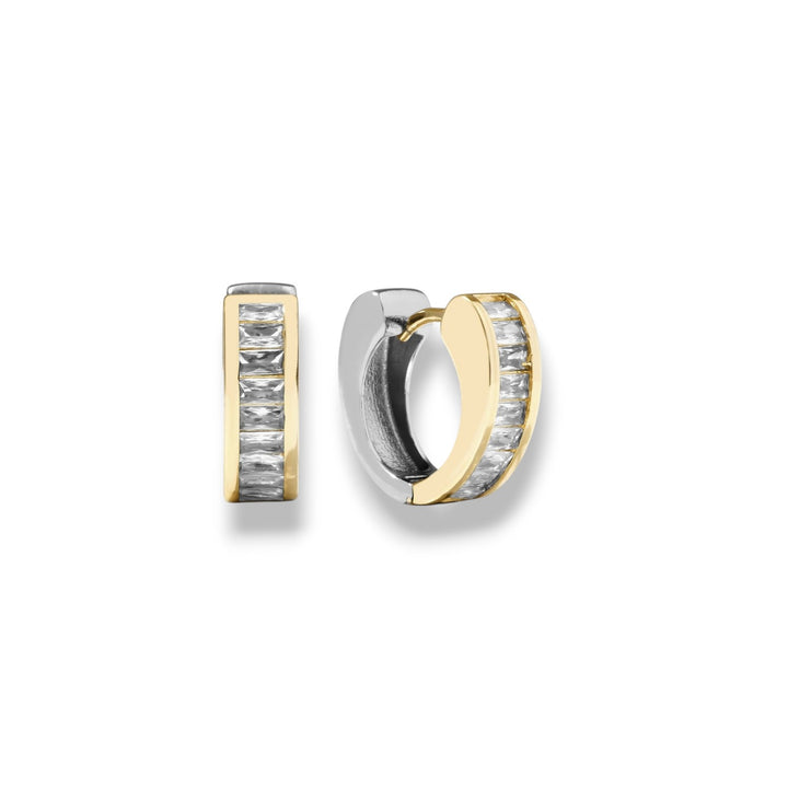 These hoops are made from Gold Filled Brass with a two-tone finish. They are adorned with channel-set baguette-cut crystals.