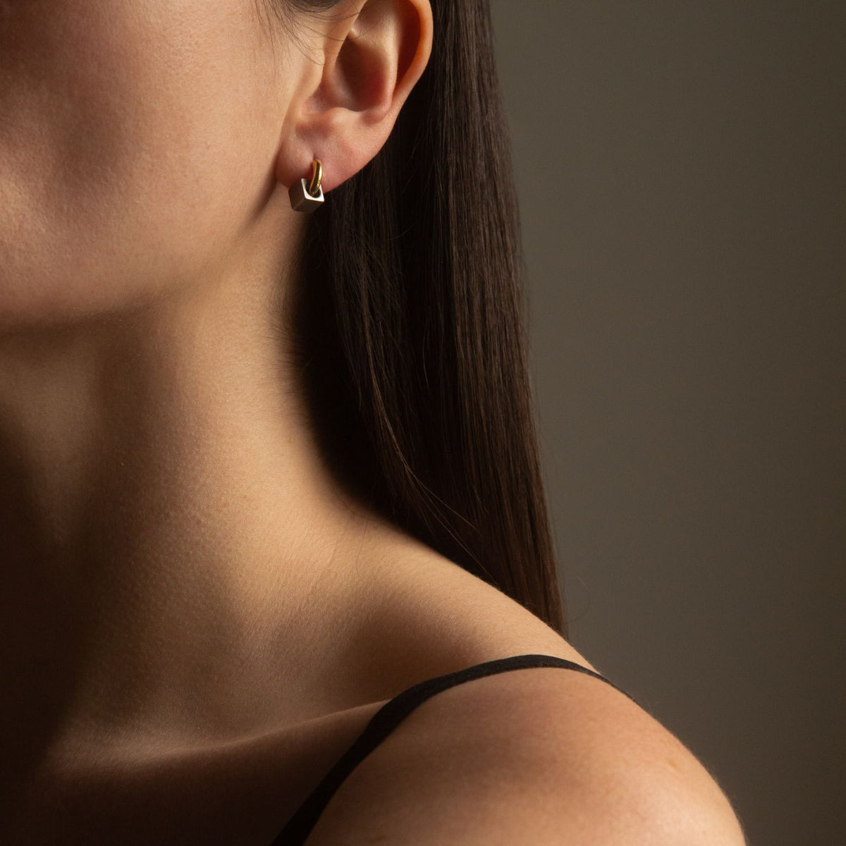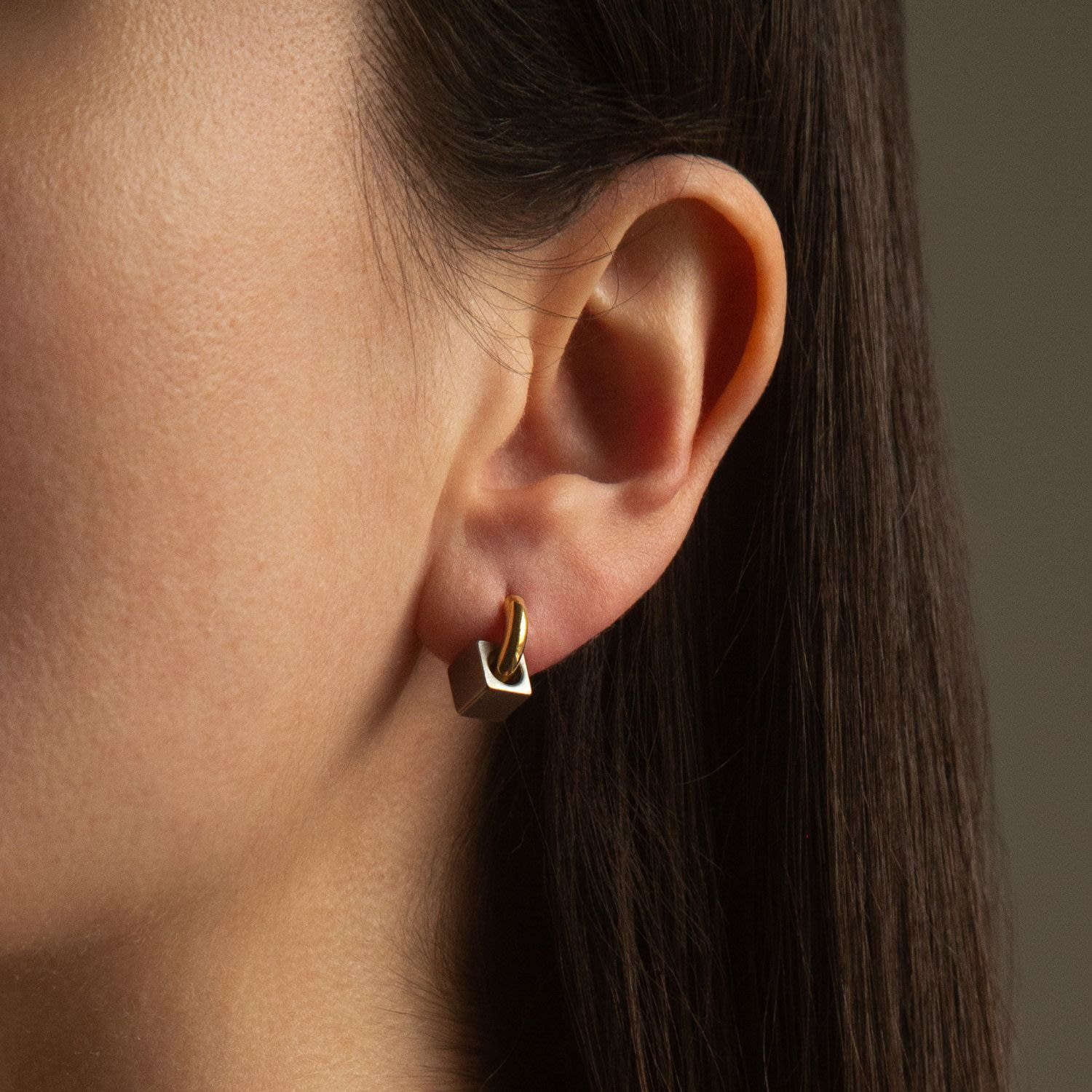 These Gold Contrast Cube Huggies by A Weathered Penny are a simple, modern, and clean accessory. These earrings hug your earlobe to perfection and are decorated with a solid silver cube that adds contrast and elevates your look. They are hypoallergenic, waterproof, and are a confident everyday accessory.