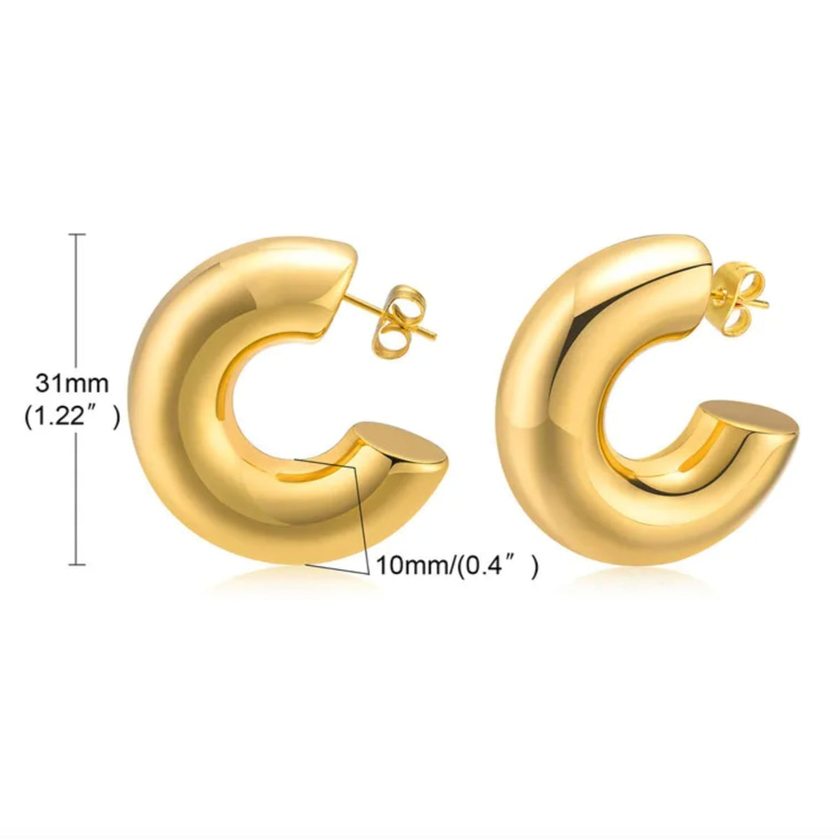 These Bold Gold Waterproof Hoops by MG Jewelry are a statement piece designed for effortless elegance and long-lasting wear. Expertly crafted from 18K gold-plated stainless steel, these hoops are waterproof, sweat-proof, and tarnish-free. Their durable design allows you to wear them anywhere—from the beach to the gym—without worry, making them a perfect staple for any jewelry collection.