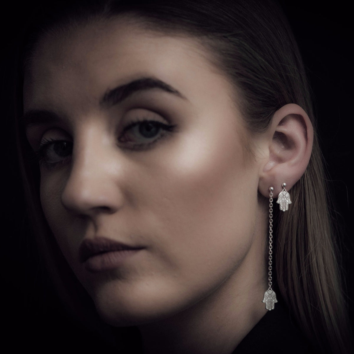 This is a single short drop earring. The material is not specified, but it's part of the Silver Hamsa Hand collection.
