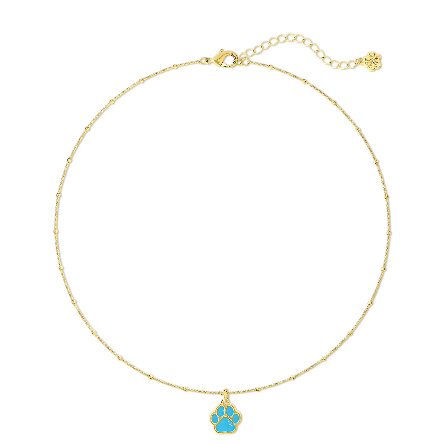 24k gold-plated brass; pastel blue enamel paw print pendant (approx. 3/8"); 15" chain with 2" extender; lobster clasp.